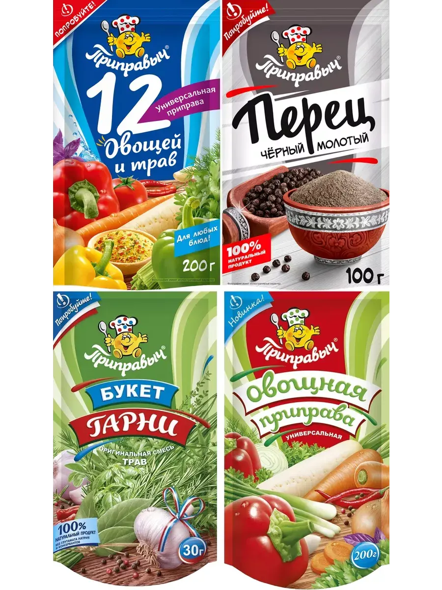 В наборе ассорти приправ 4 штуки: 12 Овощей 200г 1шт; Перец черный молотый 100г 1шт; Букет Гарни 30г 1шт; Овщная универсальная 200г 1 шт.