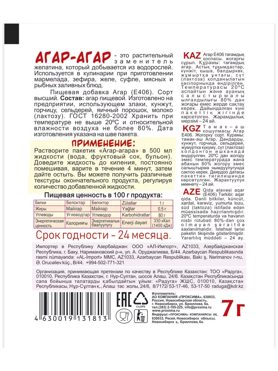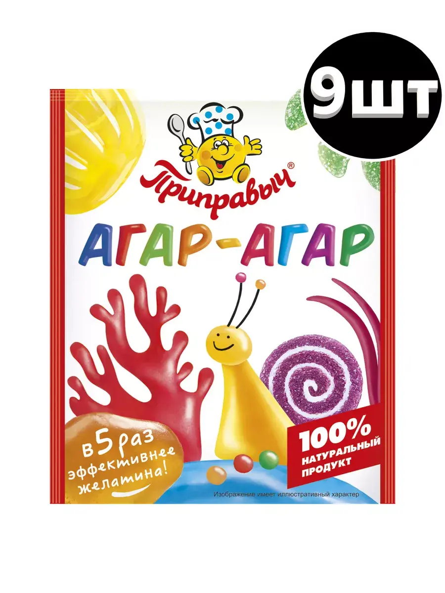 Агар-агар - это растительный заменитель желатина, который добывается из водорослей. Используется в кулинарии при приготовлении мармелада, зефира, желе, суфле, мясных и рыбных заливных блюд. Растворите пакетик «Агар-агар» в 500 мл жидкости (вода, фруктовый сок, бульон). Доведите жидкость до кипения, постоянно помешивая, варите в течение 4 минут, затем дайте остыть. Вы можете получить различные текстуры окончательного продукта, регулируя количество добавленной жидкости. В комплекте 9 пакетиков по 7г.