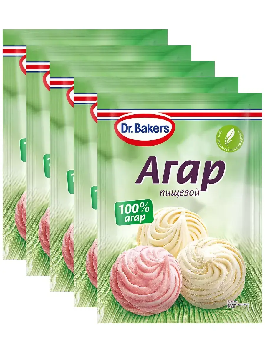 Агар - натуральный растительный загуститель. Идеально подходит для приготовления суфле, зефира и мармелада. Имеет полностью растительное происхождение. Агар Dr. Bakers - это 100% чистый агар без добавок. Одна упаковка (7 г) рассчитана на 500 мл жидкости. Способ приготовления: Содержимое упаковки смешать с 500 мл жидкости. Поставить на средний огонь и, постоянно помешивая, довести до кипения. Варить на медленном огне около 2 минут или в соответствии с инструкцией к вашему рецепту. В комплекте 5 пакетиков по 7г.