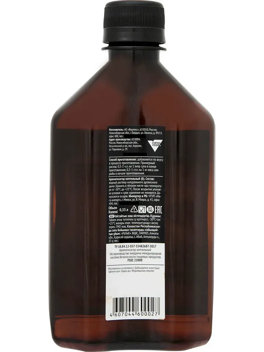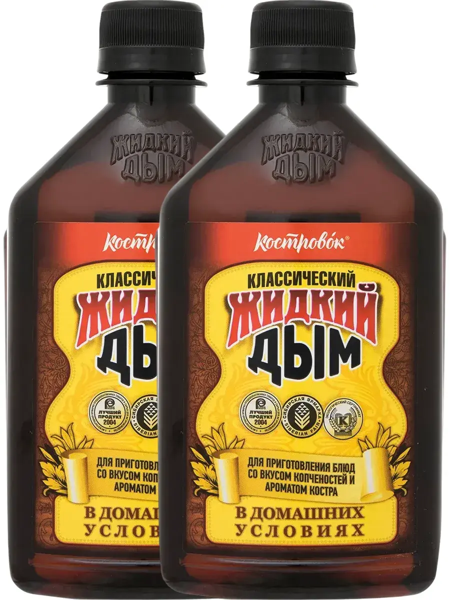 Жидкий дым — это ароматизатор натурального происхождения, который используют для придания продуктам копченого вкуса и запаха. Обычно приправа жидкий дым применяется в качестве маринада для мяса, птицы и рыбы. Его также кладут в супы и соусы для придания соблазнительного аромата «с дымком». Ароматизатор предназначен для приготовления блюд со вкусом копченостей и ароматом костра. Блюдо получается пикантным и очень ароматным, как будто оно только что приготовлено на углях. Теперь можно насладиться вкусным шашлыком, не выходя из дома: просто добавьте ароматизатор к мясу и смело отправляйте его в духовку - легко, просто и без усилий! Также подходит для запекания баклажанов, грибов, томатов и болгарского перца. Дым, образуется при сжигании традиционных для копчения пород древесины, проходит несколько степеней фильтрации. При этом смолы, канцерогены, сажа и другие вредные примеси выпадают в осадок и удаляются, а самые ценные коптильные вещества смешиваются с водой. В комплекте 2 бутылки по 330мл.