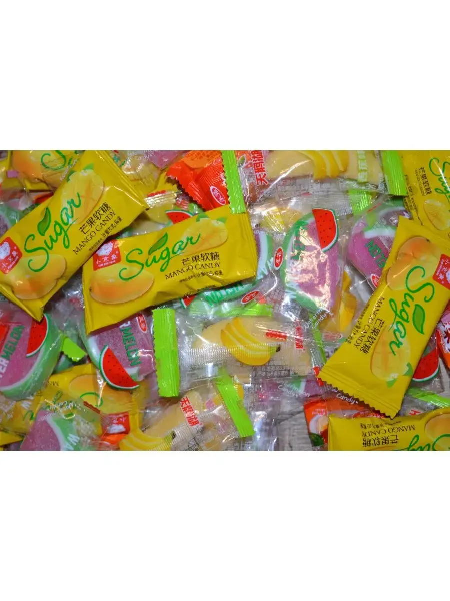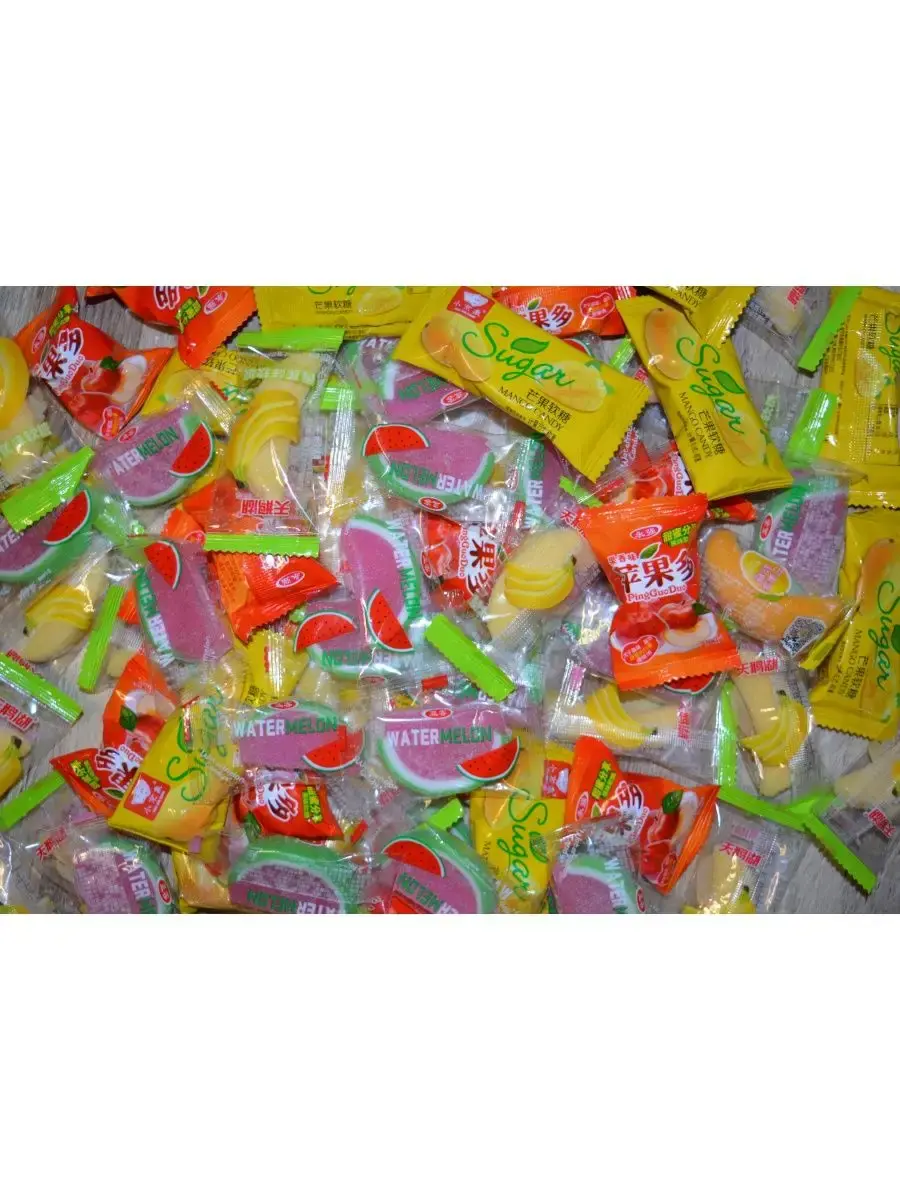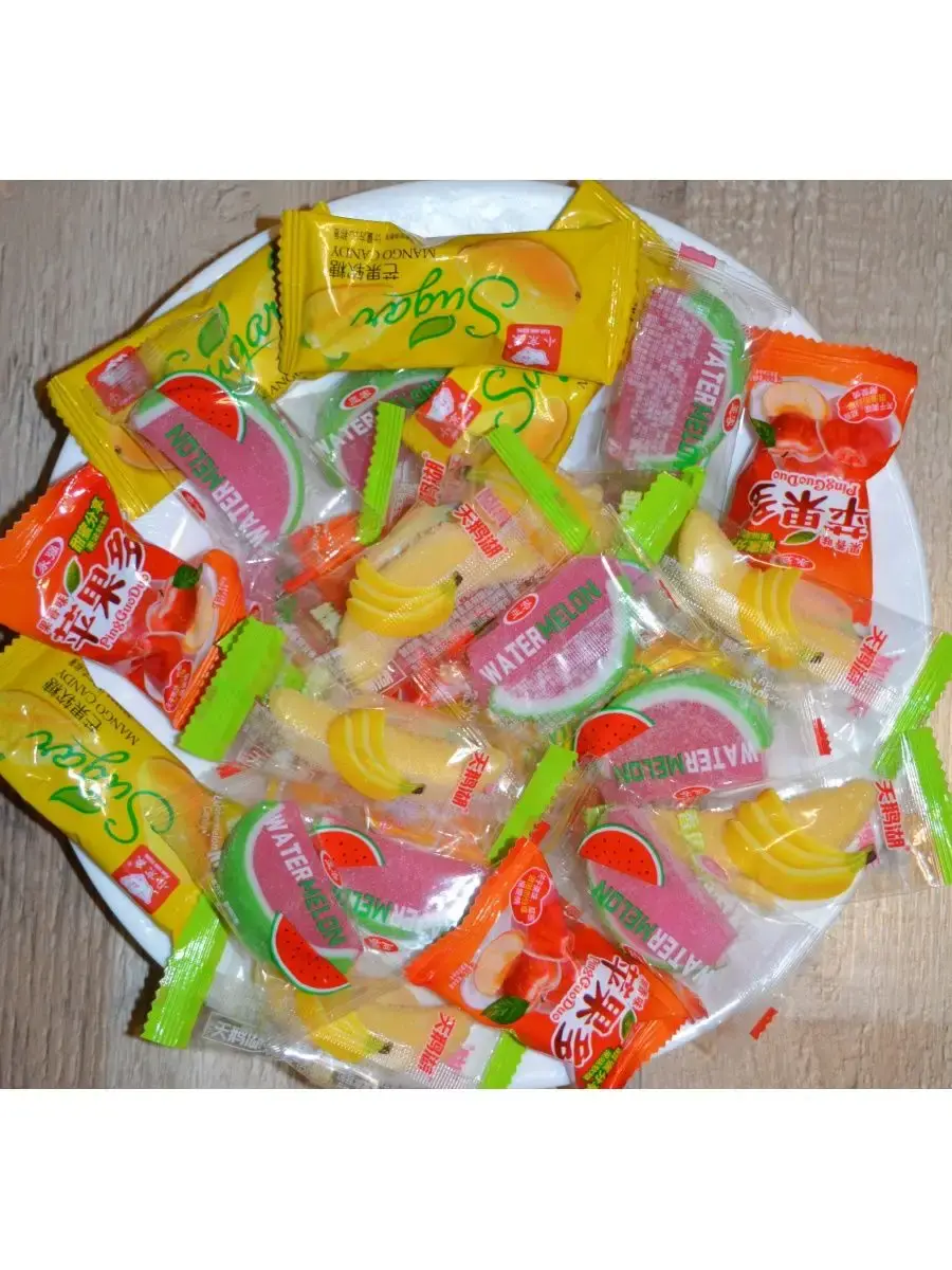 Ассорти мармеладных конфет со вкусом фруктов (яблоко, банан, арбуз, манго).