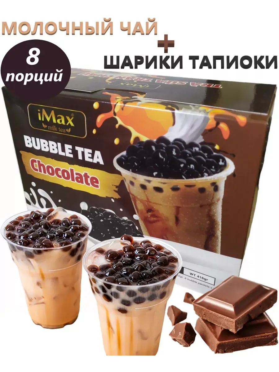Бабл Ти – это популярный напиток, который в последнее время завоевал много поклонников во всем мире. Вьетнамский молочный бабл чай со вкусом шоколада приготавливается на основе черного чая, молока и шариков тапиоки, также называемыми «жемчужины». Для приготовления необходимо залить пакетик чая кипятком, затем добавить шарики тапиоки. Такому необычному напитку, приготовленному в домашних условиях, обрадуются как взрослые, так и дети! В блоке 8 пакетиков чая с молоком по 22г и 8 пакетиков с тапиоки по 30г.