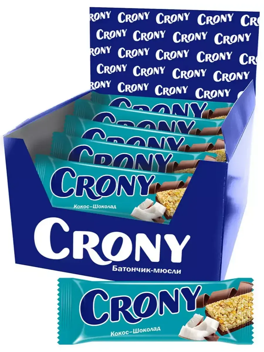 Кокосовое наслаждение! Райский кокос усиливает чувственный шоколад своим терпко-сладким вкусом и приятным ореховым ароматом. Батончик-мюсли Crony поднимет ваш жизненный тонус на все 100 %! Его основу составляют злаки, которые делают его таким питательным и вкусным. Перекусывайте всегда и везде питательными и вкусными батончиками. Crony станет вашим идеальным перекусом в любом месте — школе, офисе, путешествии, походе и спортзале. Его удобно брать с собой: благодаря компактному размеру он легко помещается в сумочках, рюкзаках и бардачках автомобилей. В блоке 12 батончиков.