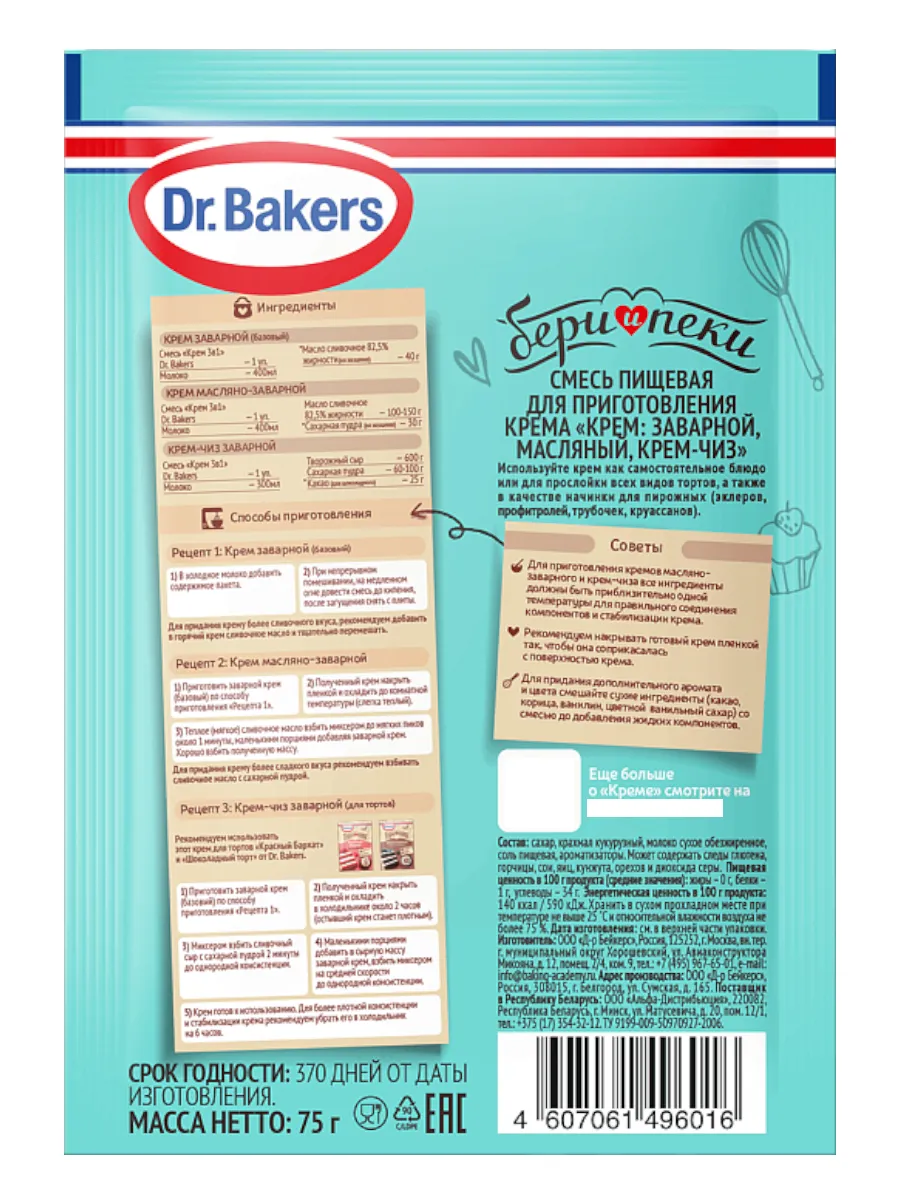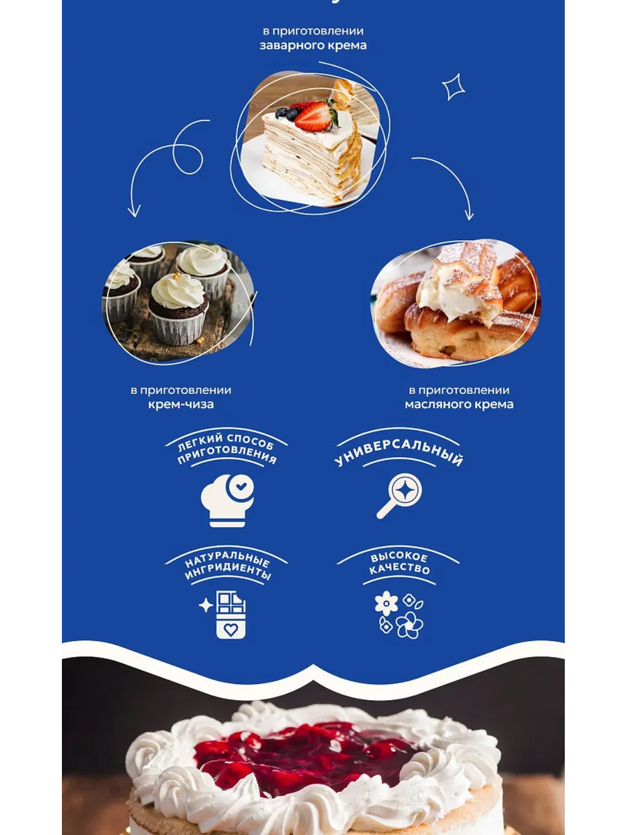 Смесь-помощник для приготовления трёх видов крема! Широкое применение для различных десертов - используйте крем как соус, для начинки пирожных и для прослойки тортов. Бери и Пеки - рецепт ваших сладких побед!