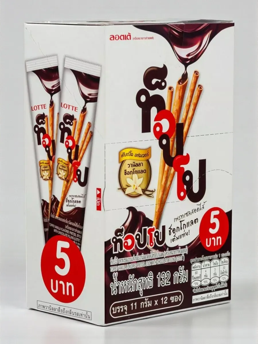 Изысканный бисквитный десерт, созданный для тех, кто ценит баланс вкуса, формы и качества. Тонкие хрустящие палочки из нежного бисквитного теста наполнены насыщенной шоколадной начинкой, которая раскрывается мягко и гармонично, не перебивая основную текстуру, а дополняя её. Продуманная технология наполнения позволяет сохранить чистоту вкуса и аккуратность подачи: шоколад находится внутри палочки, благодаря чему десерт удобно есть в любом месте — без крошек и следов на руках. Формат индивидуальных порций делает палочки Топпо идеальным выбором как для повседневного перекуса, так и для угощения к чаю, кофе или какао.