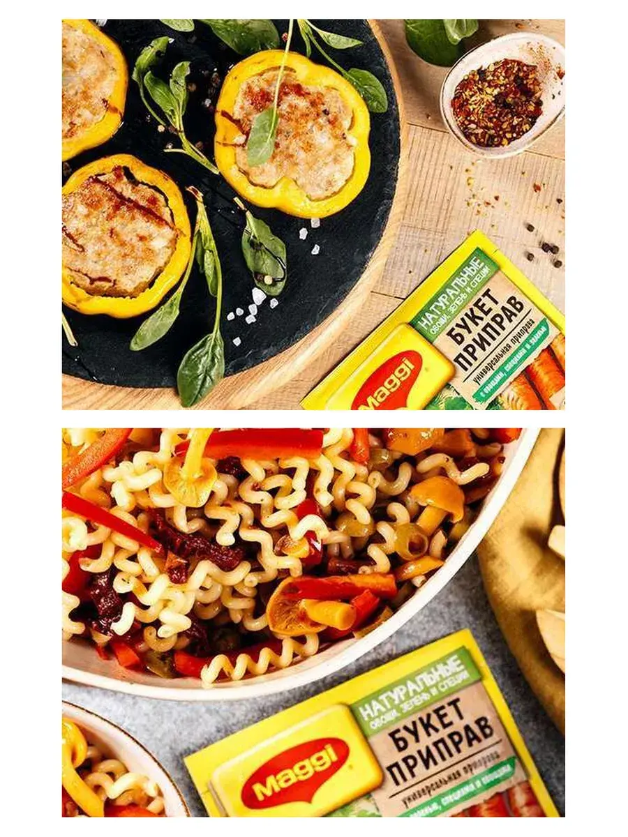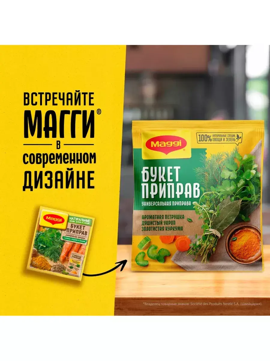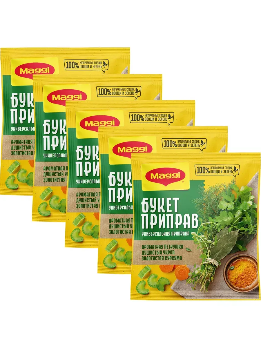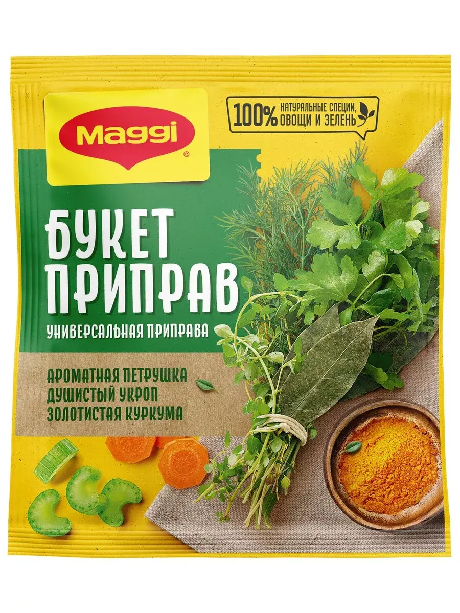 MAGGI Приправа универсальная Букет приправ - это идеально подобранная композиция натуральных овощей, зелени и специй. Ароматная петрушка, душистый укроп, золотистая куркума придадут вашим любимым блюдам особенный насыщенный вкус и аромат. Продукт уже содержит соль, попробуйте блюдо прежде чем досаливать его. Для супов: Используйте 2 чайные ложки (10 г) на 1 литр кипящей воды не менее чем за 5 мин.