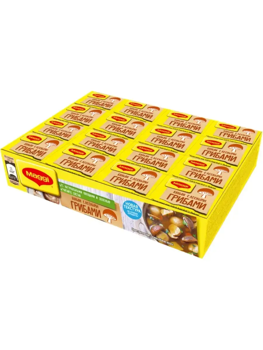В бульонном кубике MAGGI идеально сбалансированы пряности, специи, соль и ароматные лесные грибы. А натуральные овощи и зелень придадут блюду аппетитный внешний вид. Идеальное дополнение к вашим любимым грибным блюдам.Состав: Йодированная соль (соль, йодат калия), сахар, крахмал кукурузный, сухой сироп глюкозы, говяжий жир топлёный, кукурузный соус (крахмал кукурузный, соль), вода, ароматизаторы (грибы (содержат **молоко**)),овощи и зелень сушеные (0,6%) (петрушка, чеснок, лук репчатый, укроп), карамелизированный жженый сахар в порошке, регулятор кислотности (лимонная кислота), куркума порошок, сушеные белые грибы порошок (0,1%).**Продукт может содержать глютен (из пшеницы), сельдерей.**