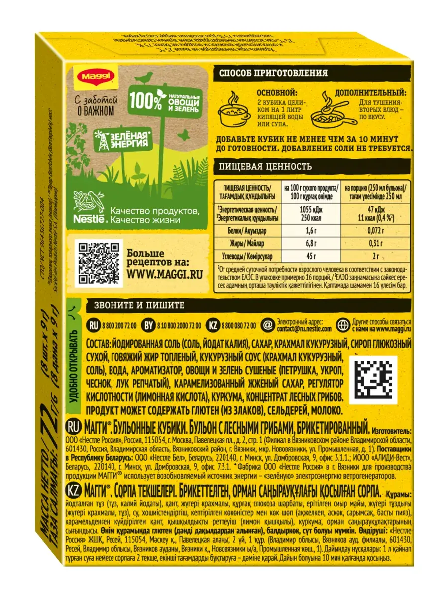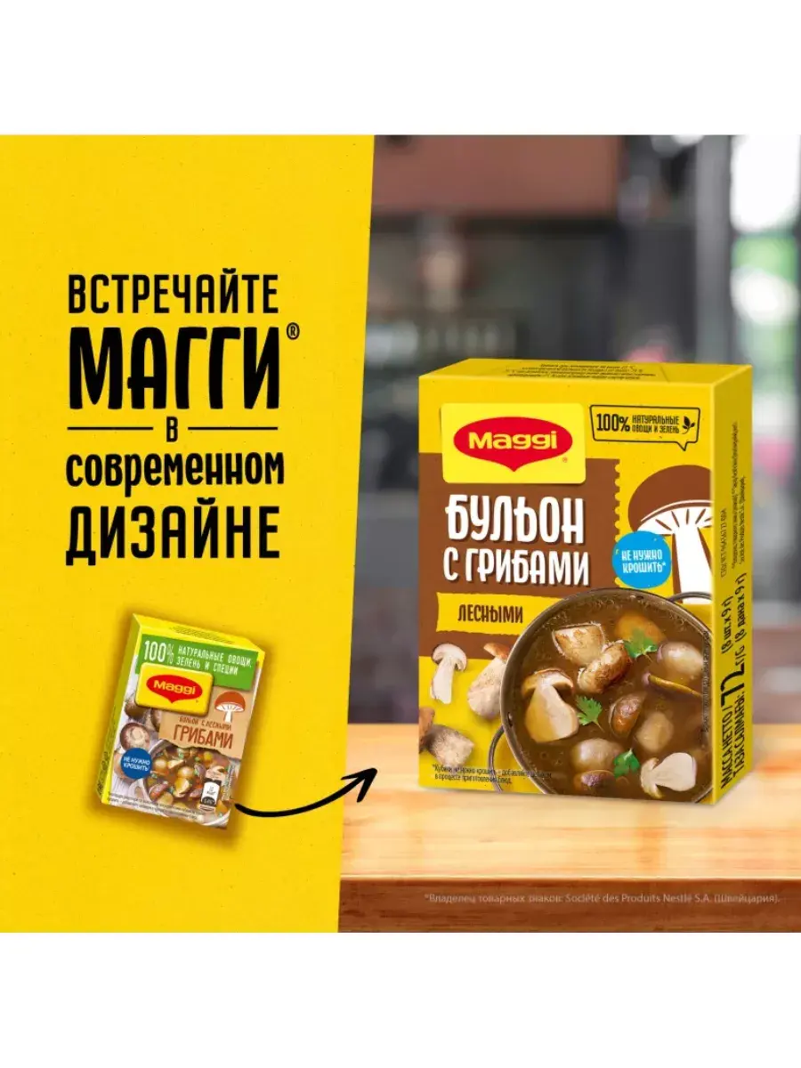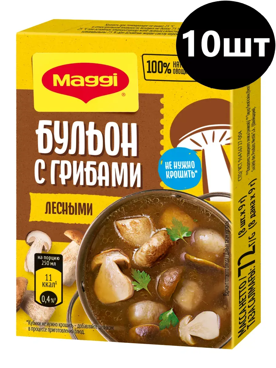В бульонном кубике MAGGI идеально сбалансированы пряности, специи, соль и ароматные лесные грибы. А натуральные овощи и зелень придадут блюду аппетитный внешний вид. Идеальное дополнение к вашим любимым грибным блюдам. В составе кубиков MAGGI теперь только знакомые ингредиенты. Производятся без добавления искусственных консервантов, а количество соли ровно столько, сколько нужно для готового блюда. Не досаливайте блюда дополнительно без лишней необходимости, так как оптимальное содержание соли в рационе очень важно для здоровья организма. Как приготовить?