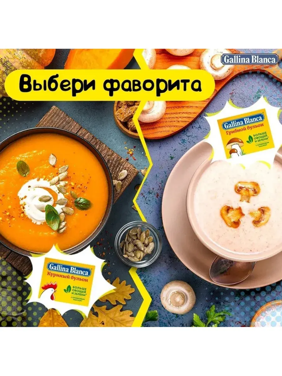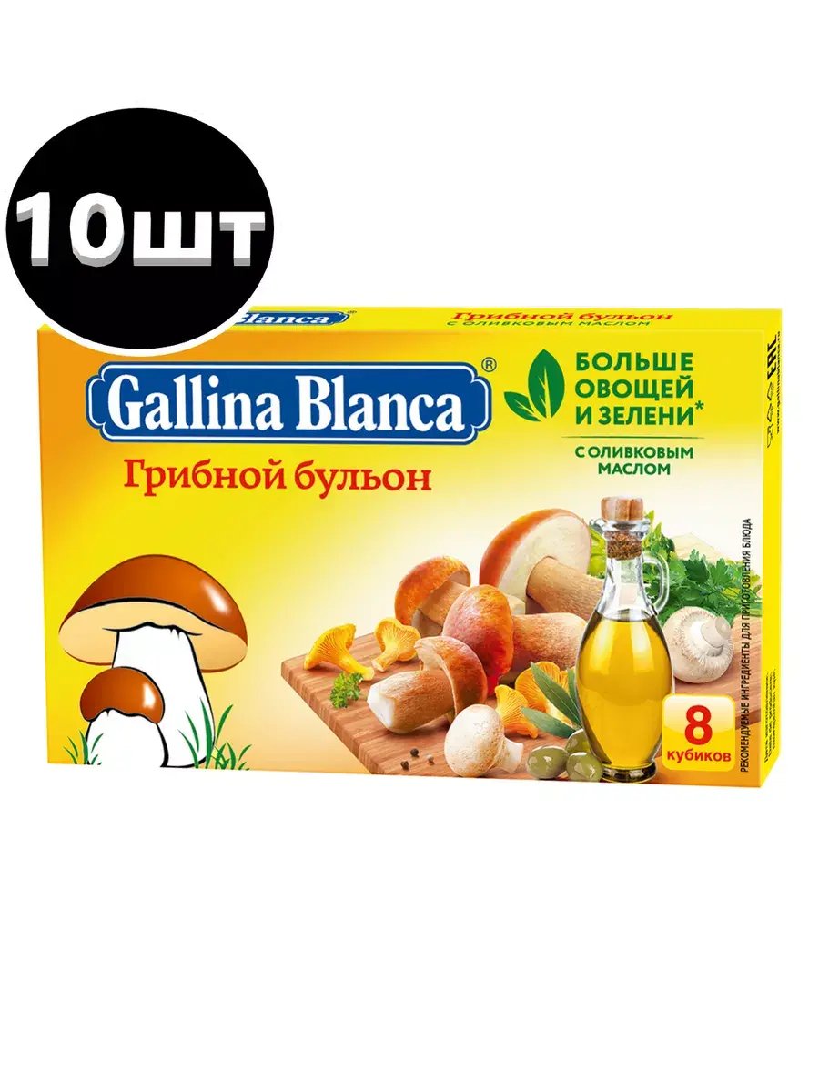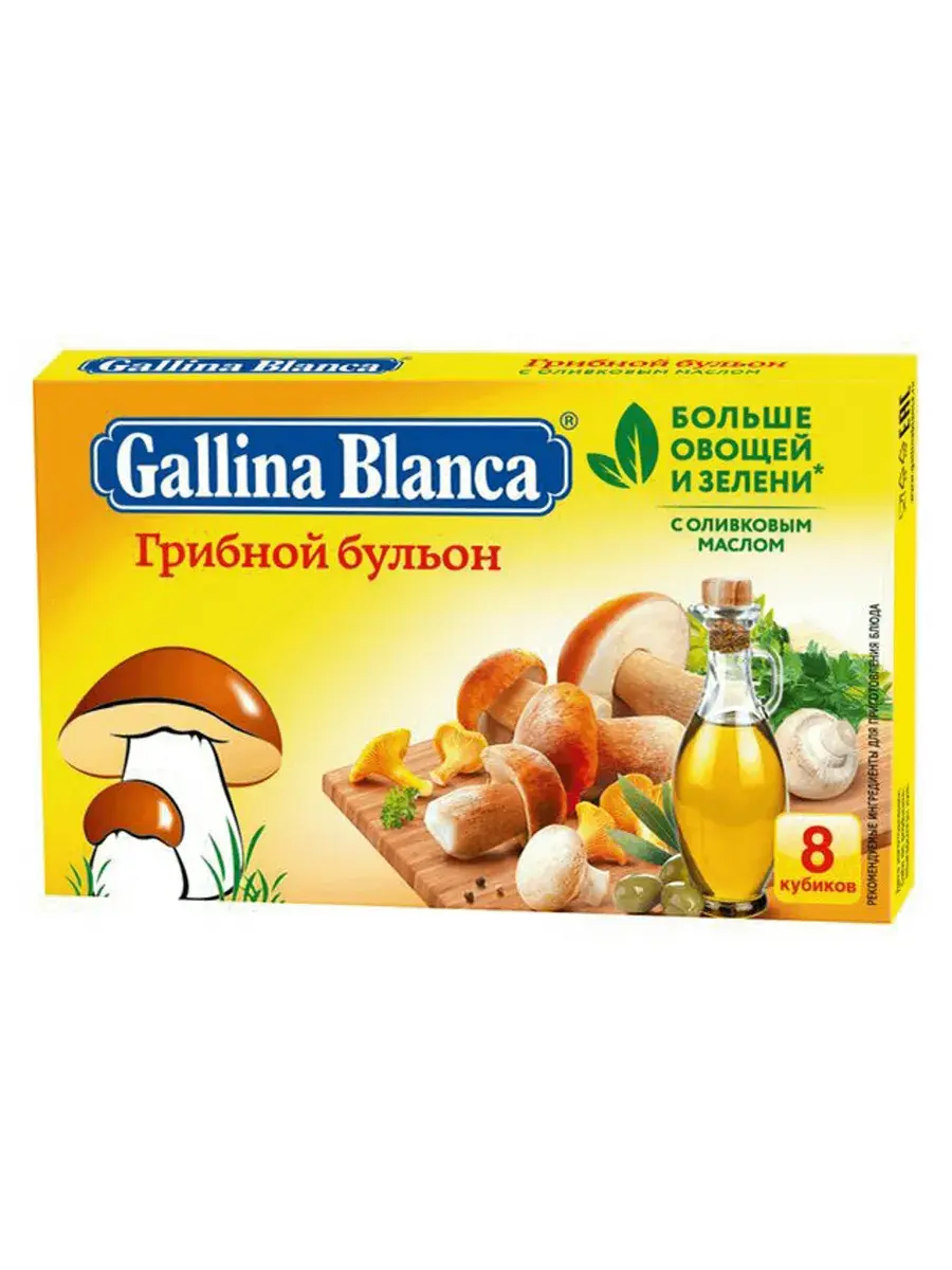 Бульонные кубики Gallina Blanca – это продукт, придающий блюдам насыщенный вкус и приятный аромат. Грибной бульон имеет универсальное применение, его можно добавить в любое блюдо, если вы хотите придать ему грибной вкус: попробуйте суп с грибным кубиком, добавьте его в фарш, рис или тушеные овощи. Особенно он хорош для приготовления супа в пост. Оливковое масло в составе. И теперь в составе еще больше овощей и зелени! В комплекте 10 блоков по 80г. В каждом блоке 8 кубиков.
