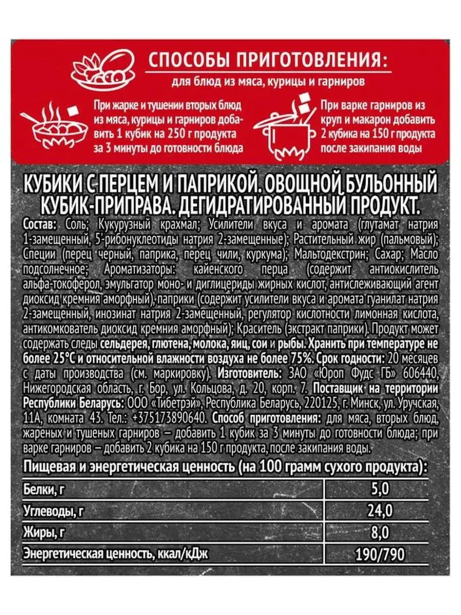 Овощной бульон в форме кубика с дополнительными ингредиентами – специями и травами. Для блюд из мяса, курицы и гарниров. Кубики придадут блюду насыщенность, а тщательно подобранная смесь трав и специй добавит необычный интересный вкус привычным продуктам. Теперь не страшно пересолить или переперчить. Точная дозировка в кубике в расчете на вес продукта поможет получить насыщенный, в меру острый и пикантный вкус, который понравится всей семье.