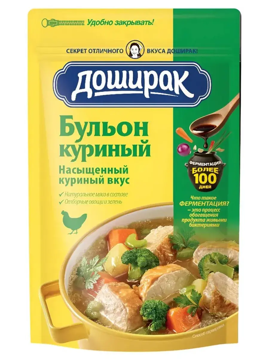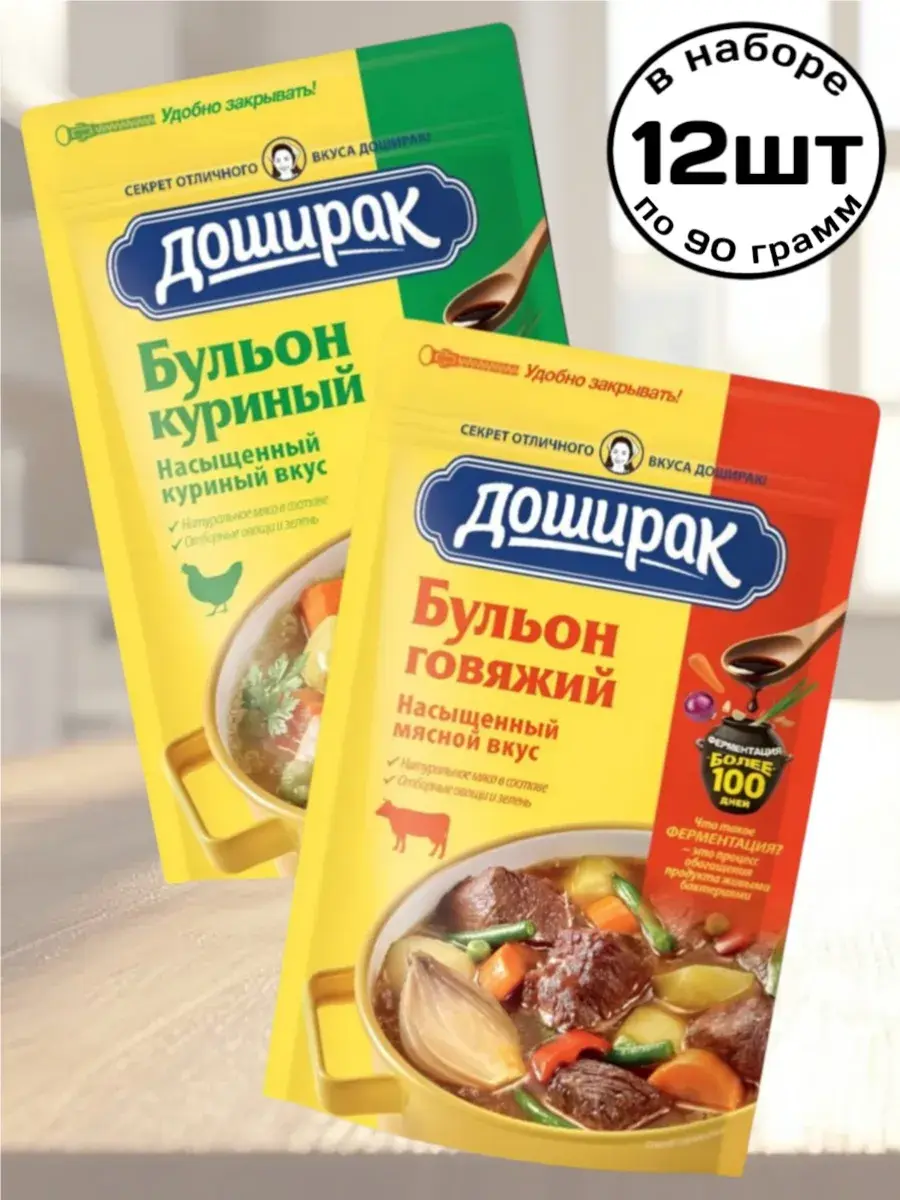Бульон куриный и говяжий марки «Доширак» — это универсальные приправы, которые сделают ваши блюда более яркими и ароматными. Они отлично подойдут для приготовления супов и рагу, а также соусов к мясу или пасте. Особая смесь специй, трав и овощей выгодно подчеркнет их вкус, добавив новые ноты. А благодаря удобной zip-lock упаковке свойства приправы останутся неизменными даже при регулярном вскрытии. В комплекте 6 штук куриных и 6 штук говяжьих бульонов по 90г.