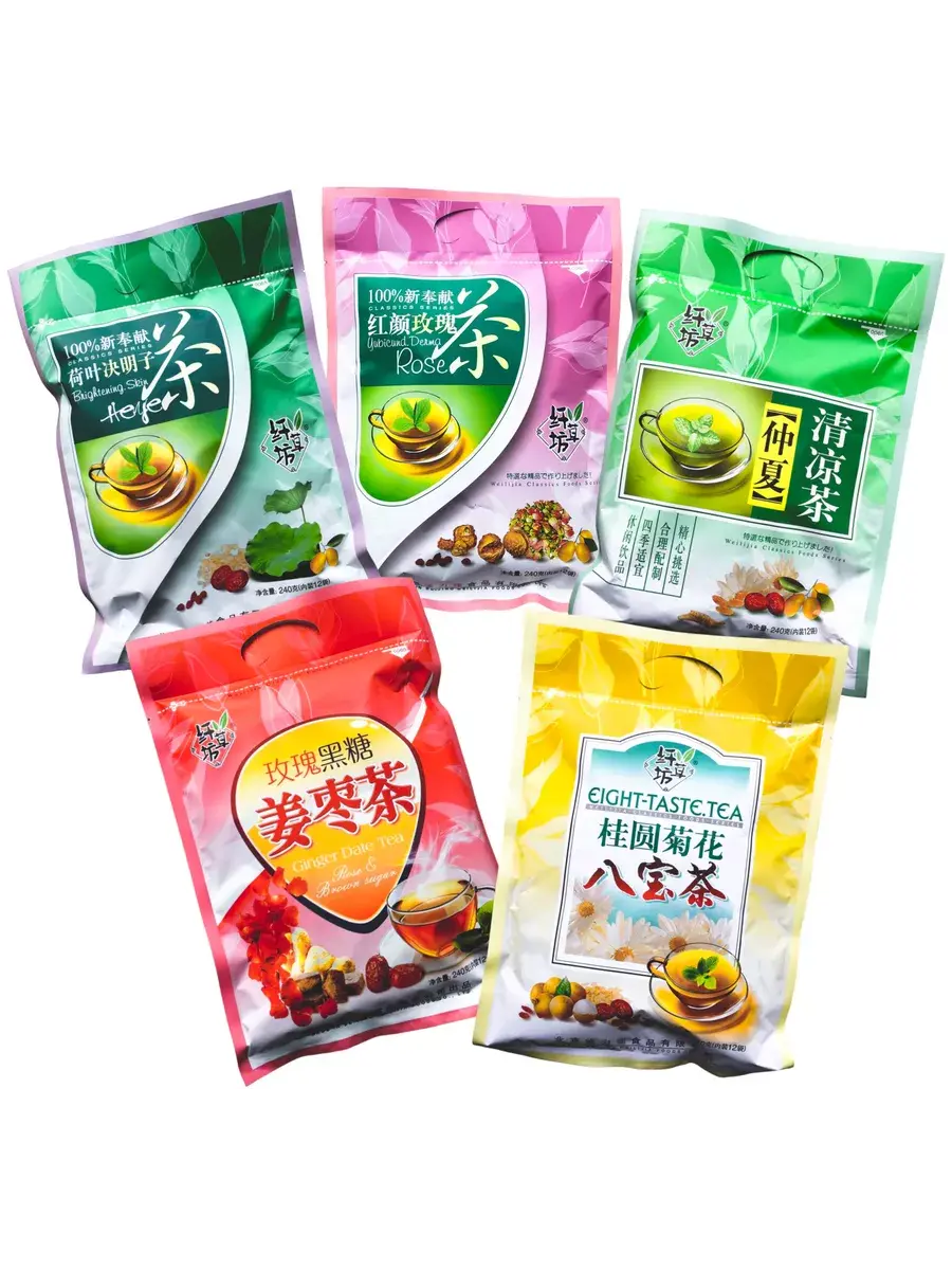 Натуральные китайские чаи изготовлены по старинным рецептам, из-за чего напиток получается безупречно мягкий и ароматный, а его тонкие цветочные ноты создают удивительно полезный эффект для организма! Основные компоненты таких напитков: зелёный чай, целебные травы, плоды деревьев, тростниковый сахар. Не зря их принято называть чаем долголетия! Омолаживающий нежный чай с ароматным вкусом розы вухако — настоящее блаженство для здоровья Вашей кожи! Этот натуральный китайский чай способствует очищению кожи от угревой сыпи. Кроме того, каждый из его компонентов благотворно влияет на состояние здоровья. Ароматный и душистый чай с лотосом глубоко, и в то же время нежно, чистит организм от токсинов. Ежедневно выпитая чашка чая будет служить чудесным дополнением к здоровому меню. Чай "Чжун ся", напиток со сладковатым вкусом и тонким ароматом, улучшает зрение, повышает циркуляцию крови, успокаивает нервную систему. Новый вид всеми полюбившегося чая БаБао специально создан для прекрасной половины человечества, является незаменимым помощником женщины в любом возрасте в нелегком труде сохранения и поддержания хорошего самочувствия и красоты. Особенно рекомендуется пить его в холодную погоду и дни менструального цикла. Чай "8 Сокровищ" изготовлен из восьми драгоценных растений, улучшает настроение, очищает мочеполовую систему, повышает иммунитет, устраняет усталость, лечит почечные заболевания и понижает давление. Способ приготовления: Выложите содержимое пакетика в чашку и залейте кипятком. Дайте напитку настояться 10 минут. В комплекте 5 пачек ассорти по 240г, в каждой пачке 12 пакетиков чая.