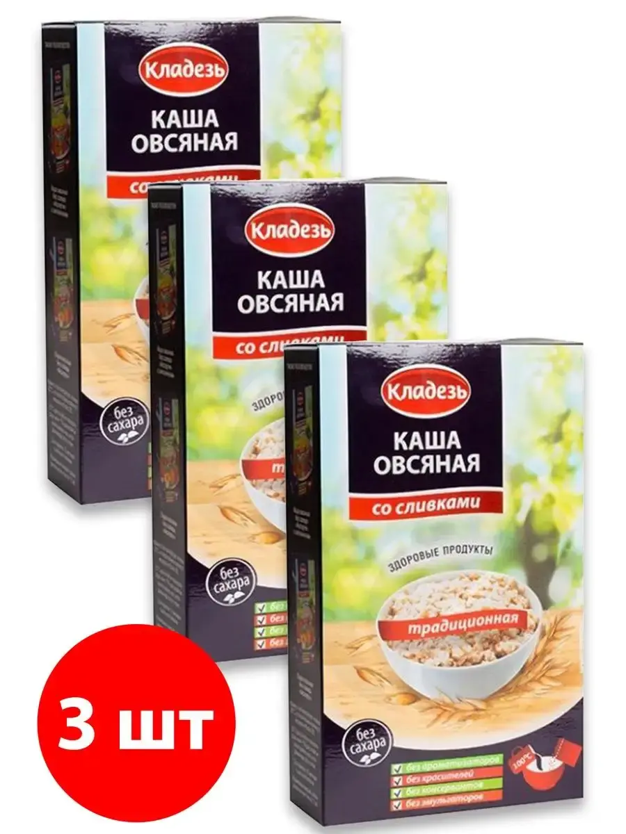 Овсяная каша быстрого приготовления "Ассорти" со сливками и сливочным маслом на фруктозе. Не содержит ароматизаторов, красителей, эмульгаторов и сахарозы. Каша обогащена витаминно-минеральным комплексом, включающим витамины группы B, PP(ниацин), С , A, фолиевую кислоту, а также железо и кальций. В упаковке 5 разных вкусов: Каша овсяная "Обыкновенная масляная" со сливочным маслом; с клубникой и сливочным маслом; с лесными ягодами и сливками; с вишней и сливками; с курагой и миндалем со сливками.