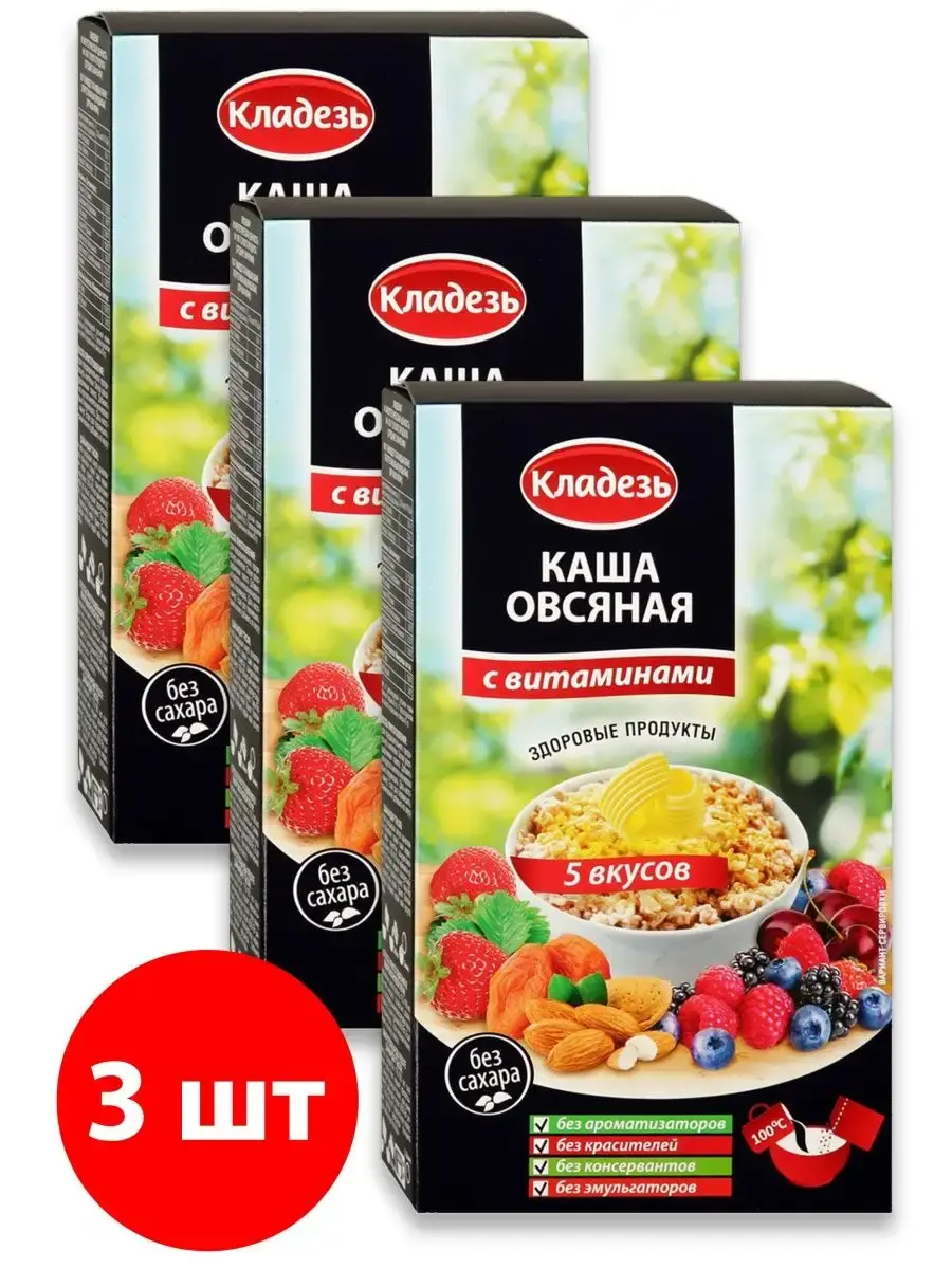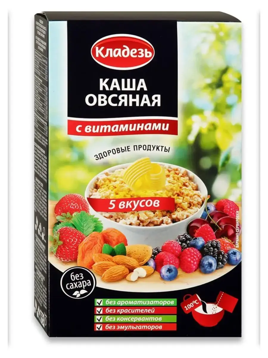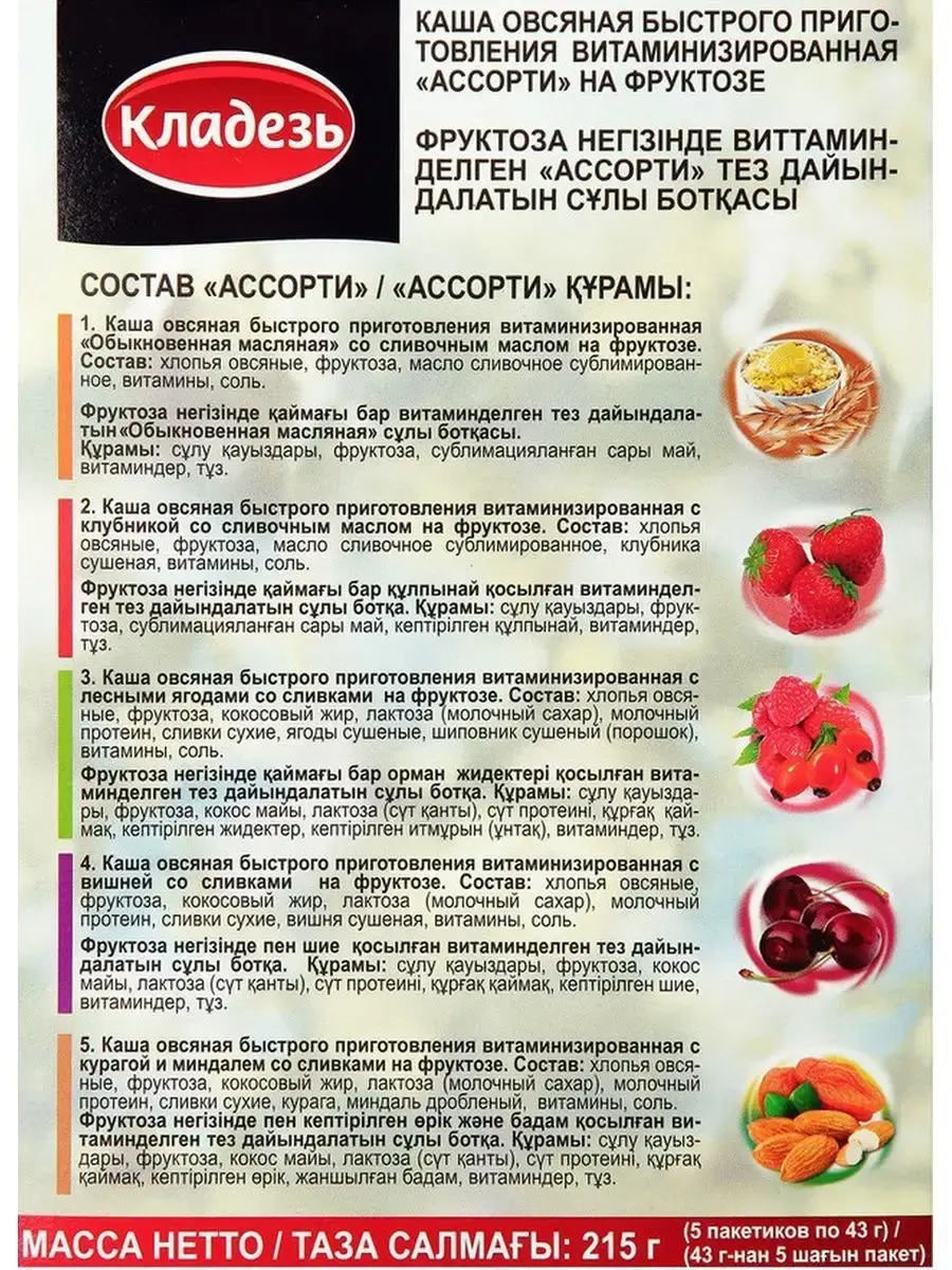Овсяная каша быстрого приготовления "Ассорти" со сливками и сливочным маслом на фруктозе. Не содержит ароматизаторов, красителей, эмульгаторов и сахарозы. Каша обогащена витаминно-минеральным комплексом, включающим витамины группы B, PP(ниацин), С , A, фолиевую кислоту, а также железо и кальций. В упаковке 5 разных вкусов: Каша овсяная "Обыкновенная масляная" со сливочным маслом; с клубникой и сливочным маслом; с лесными ягодами и сливками; с вишней и сливками; с курагой и миндалем со сливками.