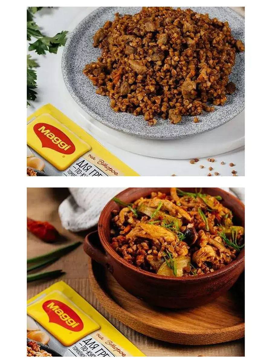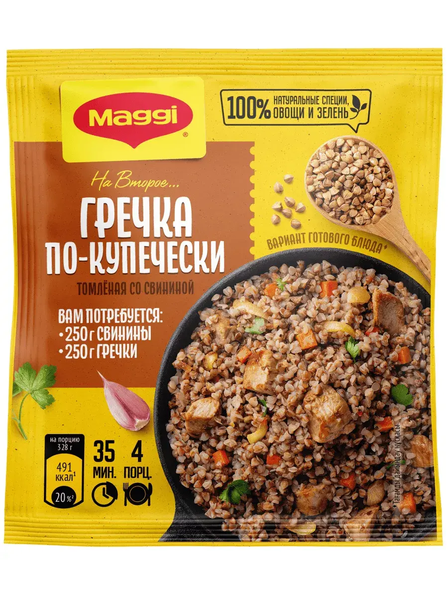 MAGGI НА ВТОРОЕ предлагает вам замечательный рецепт гречки по-купечески для приготовления без лишних хлопот. Уникальная композиция натуральных овощей, ароматных трав и пряных специй и пошаговая инструкция помогут вам приготовить гарантировано вкусное блюдо на обед или ужин для всей семьи.
