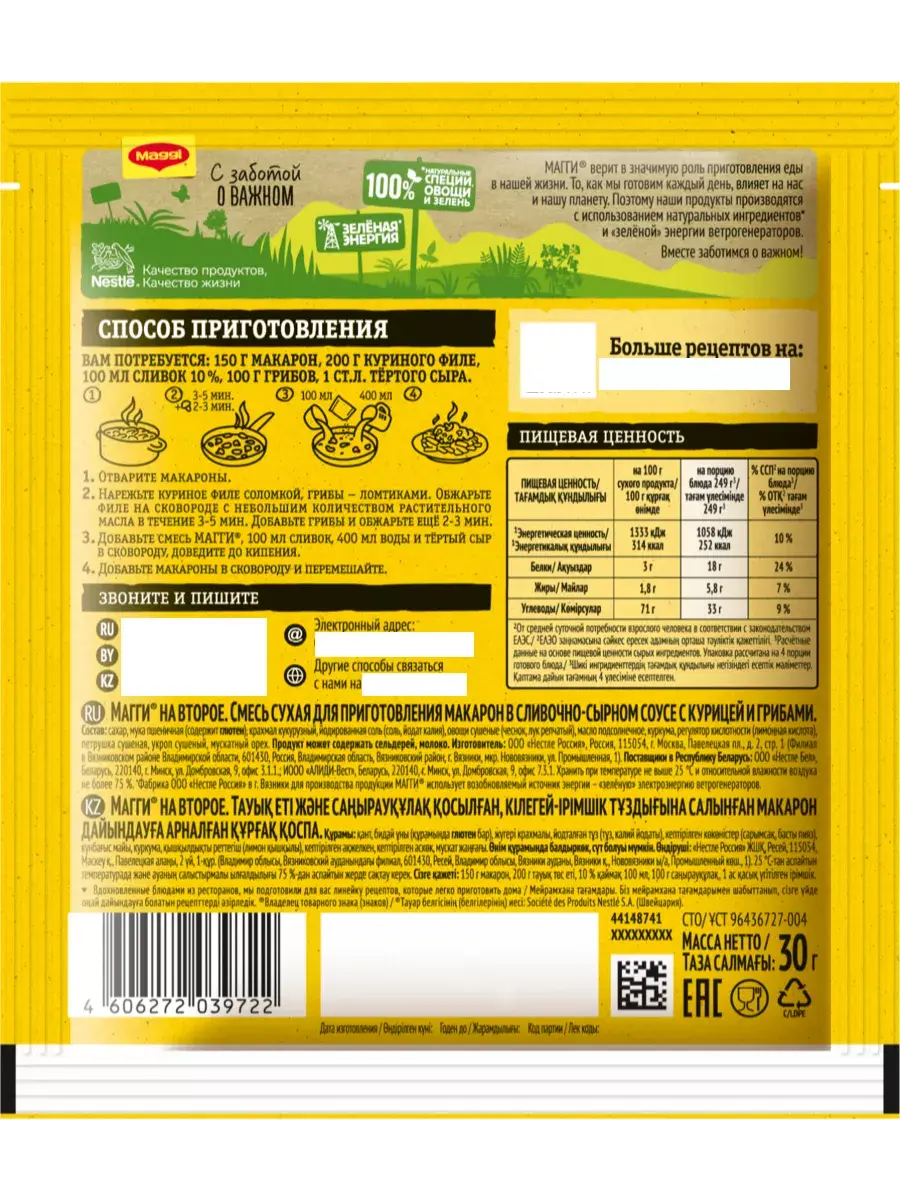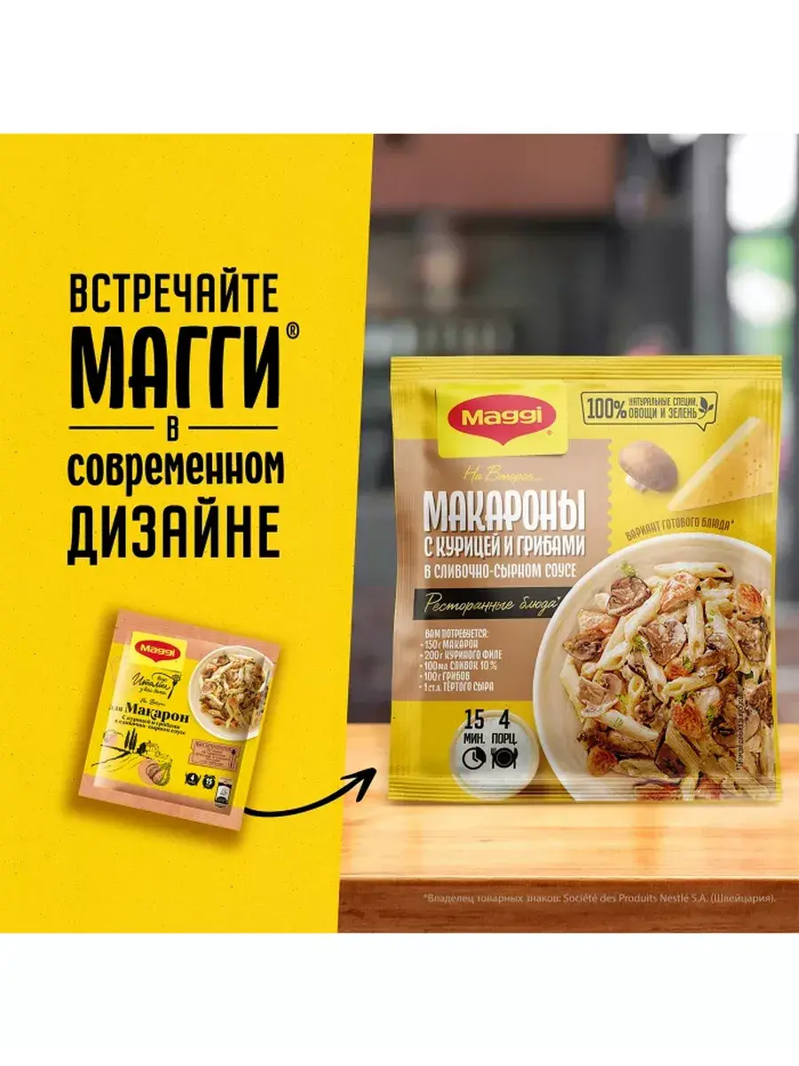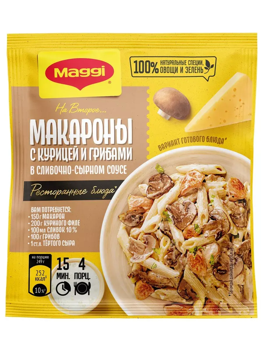 MAGGI На второе для макарон по-итальянски в сливочно-сырном соусе с курицей и грибами — это смесь сушеных овощей и специй для приготовления аппетитной пасты на всю семью. В ее состав входят натуральные лук и чеснок, а также букет грамотно подобранных приправ и душистых трав — куркума, мускатный орех, петрушка и другие. Настоящий вкус Италии у вас дома!