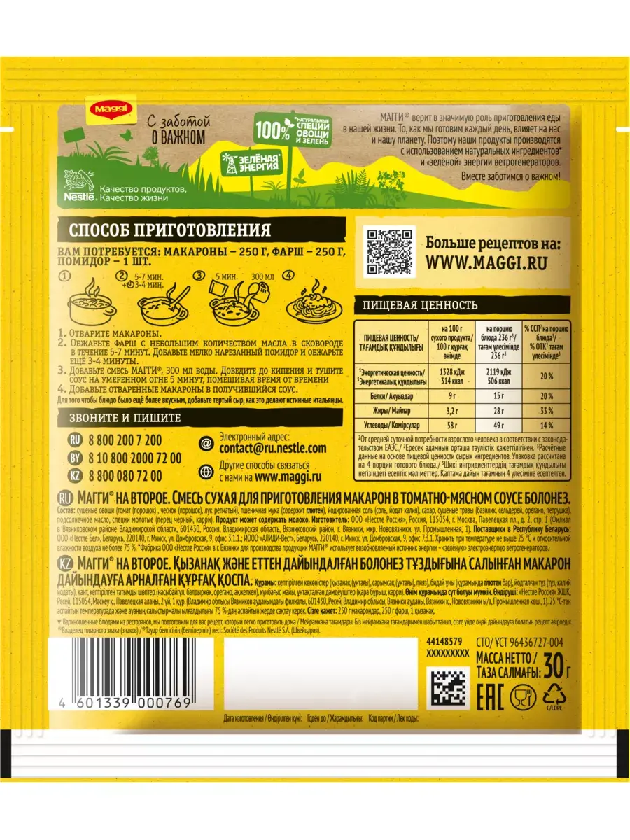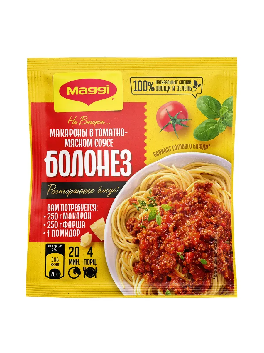 Идеальная паста Болоньезе по-итальянски с нежным мясным фаршем в томатном соусе... Звучит аппетитно? Тогда приготовьте вкусные макароны по классическому рецепту прямо у себя дома с помощью MAGGI На второе. В ее состав входят сушеные овощи — томат, чеснок и лук, а также пряные травы и специи — базилик, сельдерей, орегано и петрушка.