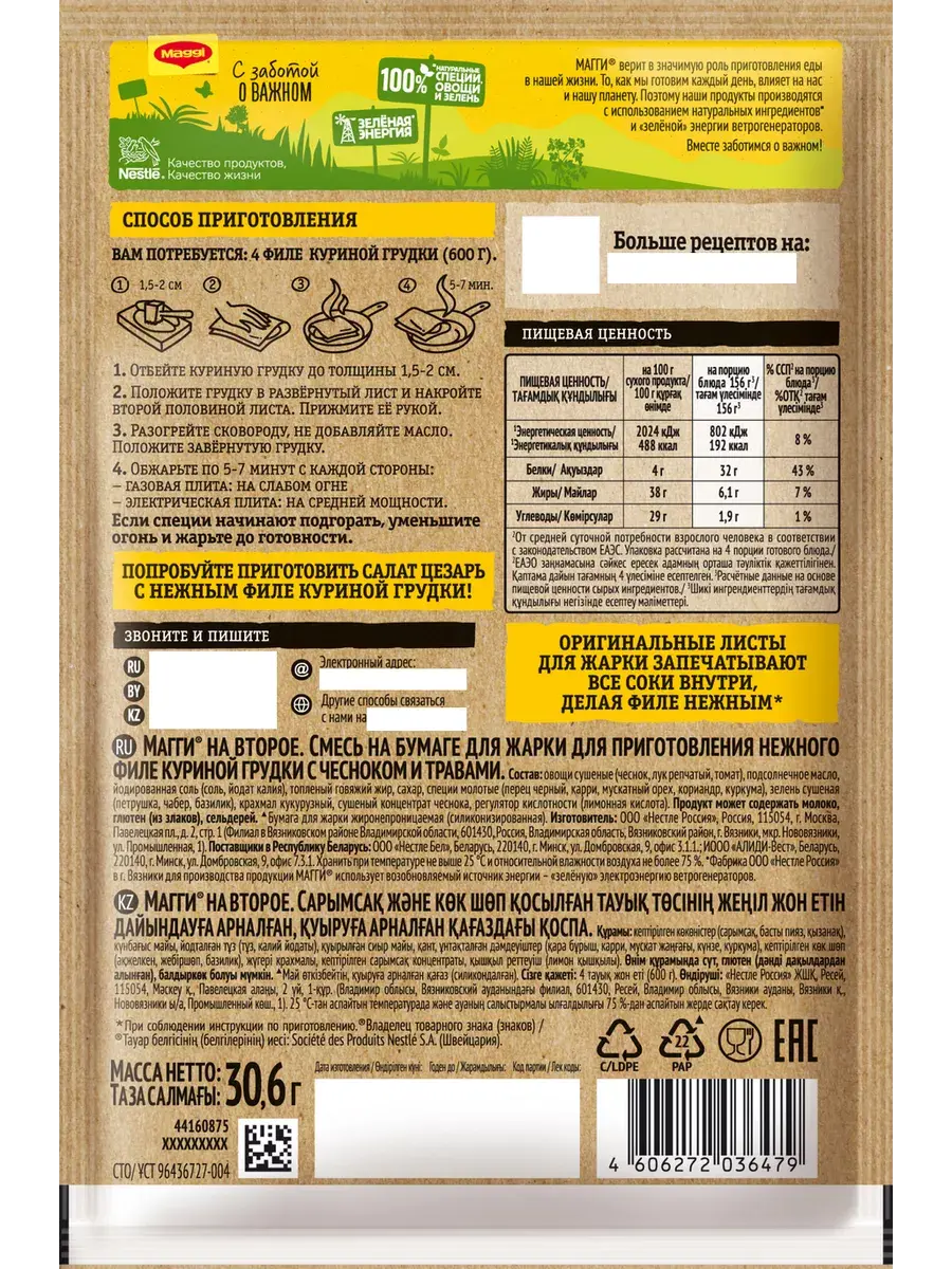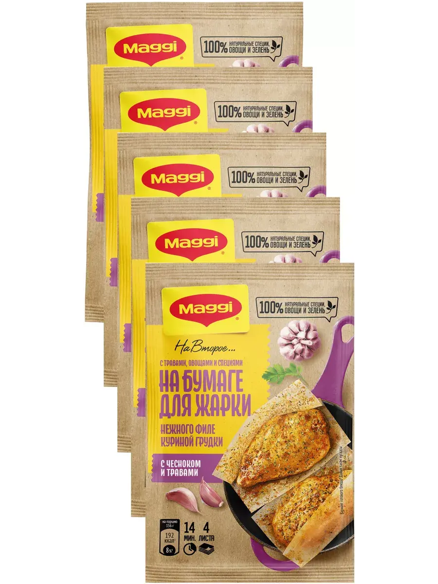 Листы для жарки MAGGI На второе с готовой смесью для рецепта — это уникальный способ быстрого приготовления сочного куриного филе с чесноком и травами. Больше не нужно изучать сложные рецепты и тратить ценное время, стоя за плитой. С MAGGI вы легко сделаете ресторанное блюдо дома всего за 14 минут! Листы со слоем приправ и специй "запечатывают" внутри мяса все соки и делают его более нежным. Уникальные листы для жарки позволяют сохранить всю сочность и нежность куриного филе без дополнительного добавления масла. В комплекте 5 штук.