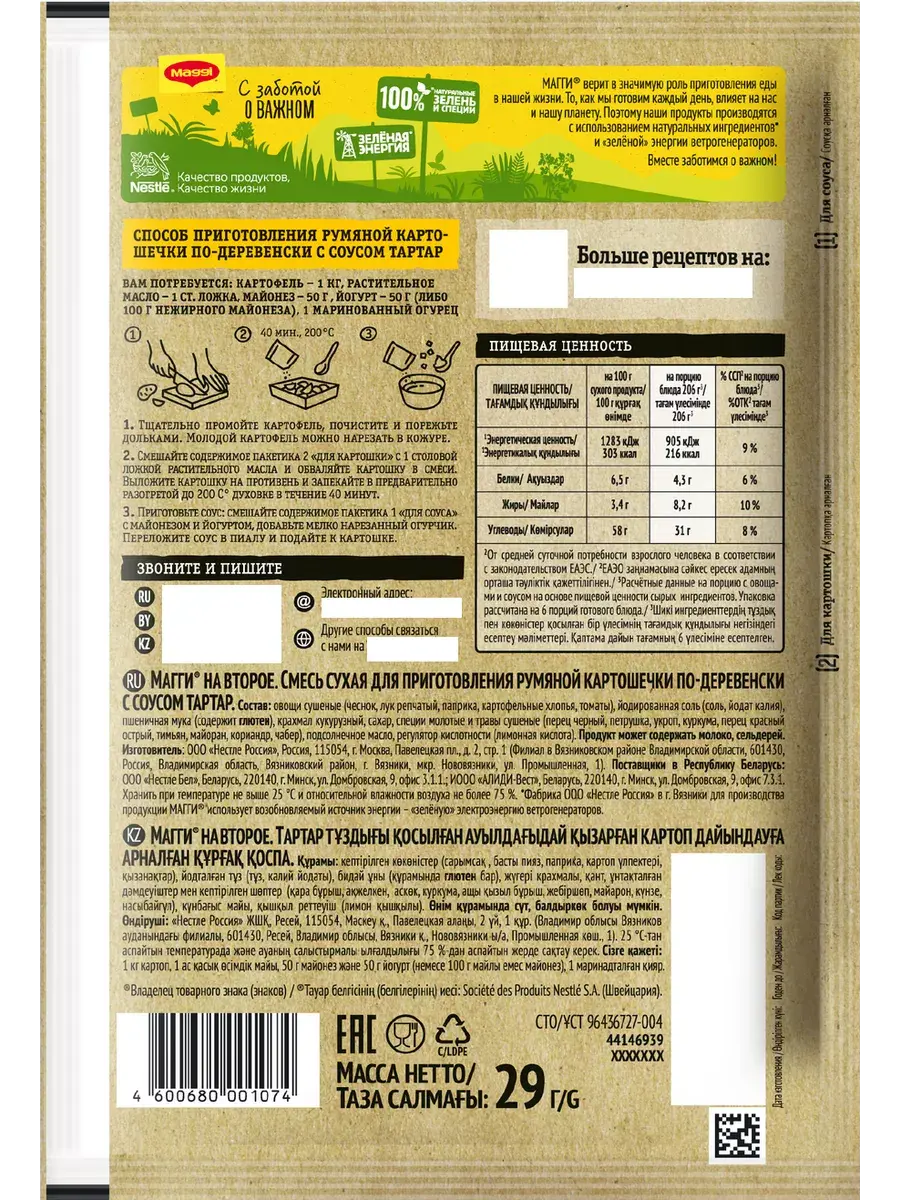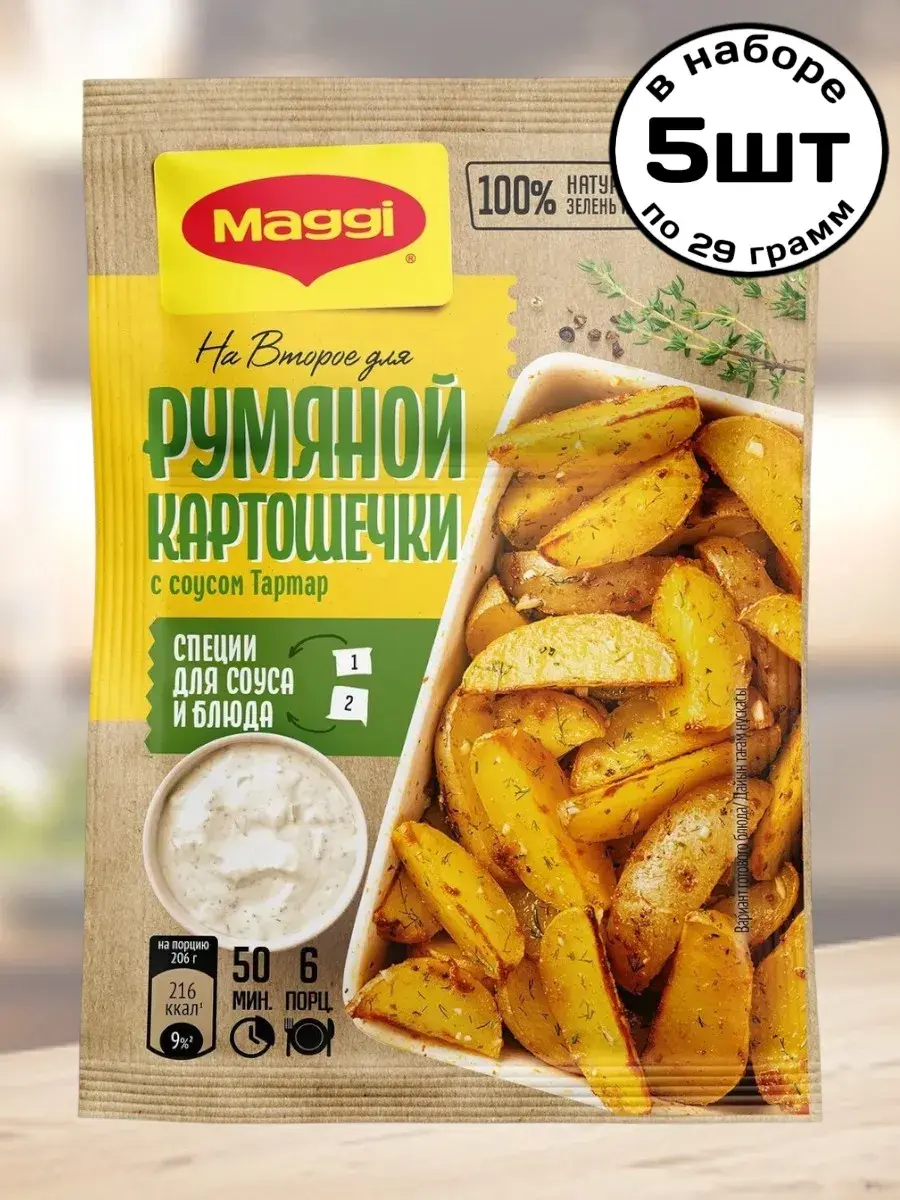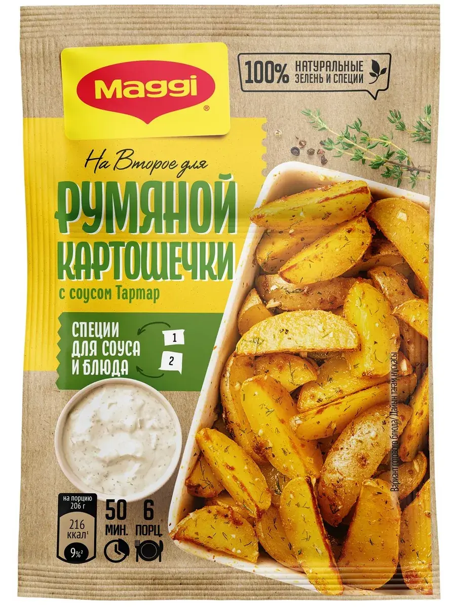 Порадуйте ваших близких незабываемым вкусом любимой картошечки! В двойном пакете вы найдете готовую смесь для приготовления золотистого слегка поджаренного картофеля, а также смесь для нежного сливочного соуса тартар. Душистый рубленный чесночок, яркие специи и пряные травы придадут блюду изысканный аромат и неповторимый вкус.