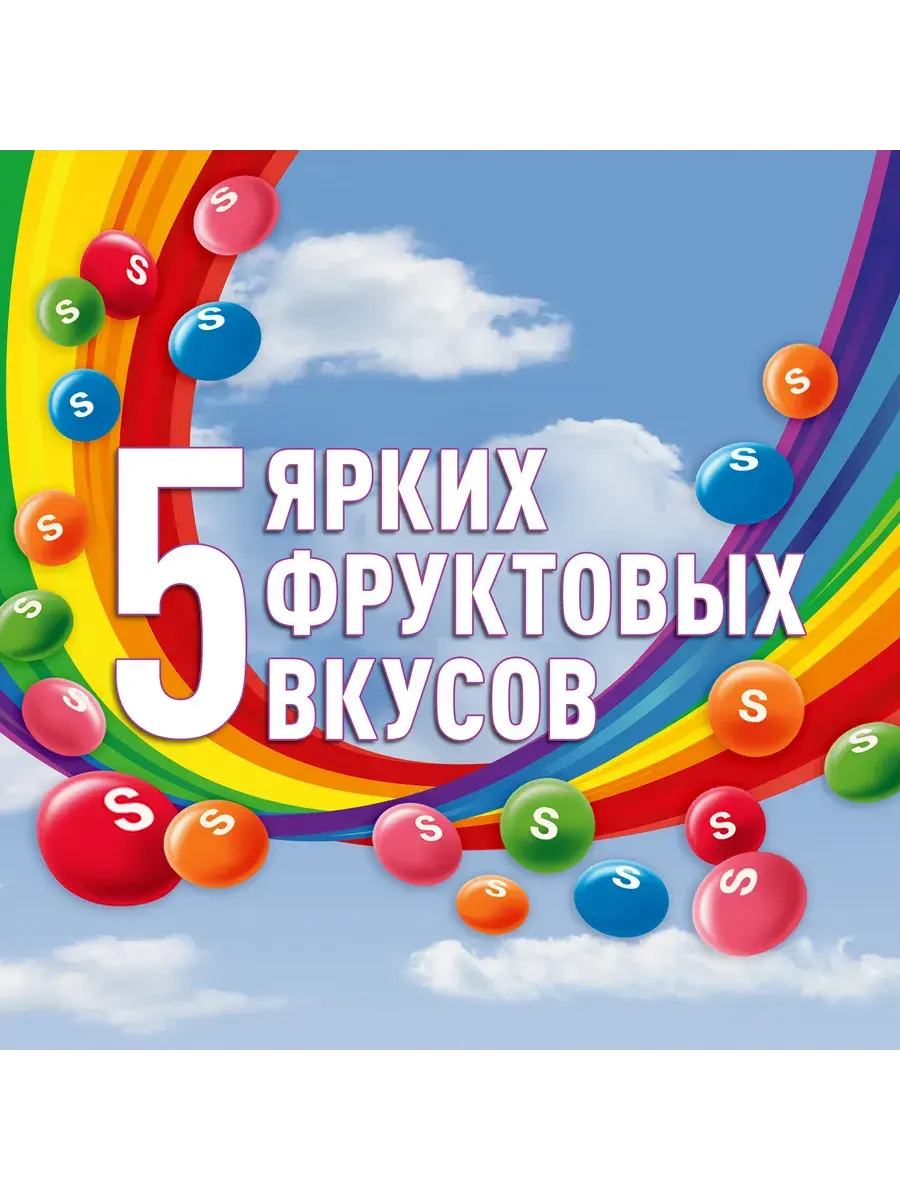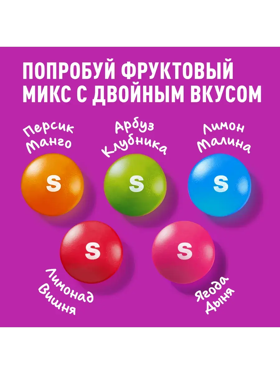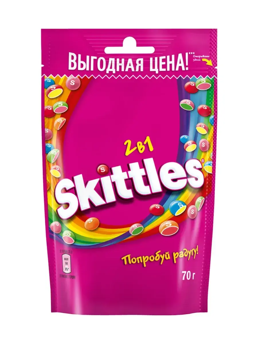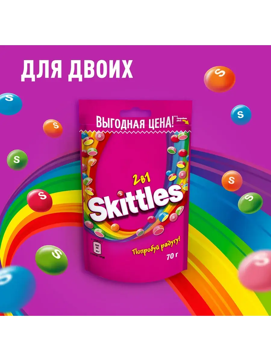 Жевательные конфеты Skittles c разноцветной глазурью — это радуга фруктовых вкусов в каждой упаковке! Вкус «2 в 1» предлагает в два раза больше радуги, ведь в каждой конфете – два фруктовых вкуса! В новой серии тебя ждут неожиданные, но невероятно вкусные дуэты: Персик + Манго — нежный, сладкий и тропически сочный. Арбуз + Клубника — летний хит с лёгкой кислинкой. Лимон + Малина — бодрящее и яркое сочетание. Лимонад + Вишня — игривый вкус с ноткой газировки. Ягода + Дыня — сладкий дуэт для настоящих гурманов Эта упаковка создана, чтобы делиться. Возьми с собой, угощай друзей, радуй близких. Заразись радугой, попробуй радугу!
