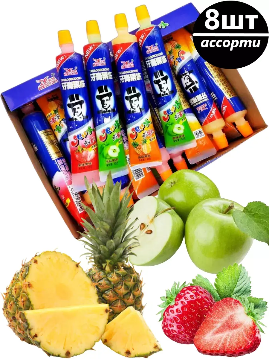 Фруктовый сок-желе в виде зубной пасты — это креативная сладость, которую оценят как взрослые, так и дети! Такой десерт из Китая по вкусу напоминает сок и мякоть настоящих фруктов. Формат "зубной пасты" это не только оригинальный дизайн, но и удобство в использовании. Просто откройте крышечку тюбика и наслаждайтесь перекусом. Сок-желе можно брать с собой на учебу или в дорогу. Благодаря удобной упаковке, сок-желе можно съедать порционно, не боясь, что содержимое разольется у вас в сумке. В наборе представлено 3 вкуса: клубника, яблоко и ананас. В таком ассорти каждый найдет для себя свой фаворит.