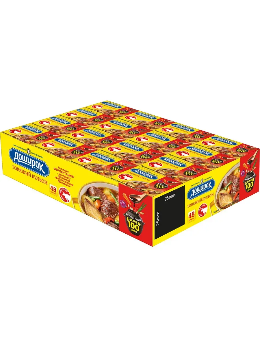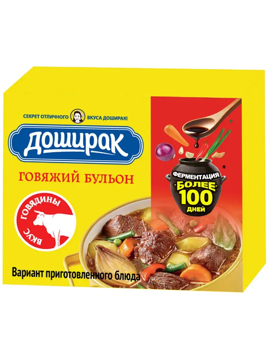 Бульонные кубики “Доширак” Говяжий бульон — это универсальная основа для любых кулинарных экспериментов: от ароматного супа и насыщенного соуса до сытного жаркого и овощного рагу. Каждый кубик создан с использованием уникальных ингредиентов, прошедших особую технологию ферментации более 100 дней. Ферментация обогащает продукт живыми бактериями, придавая ему особый вкус и неповторимую глубину аромата. Такой бульон не только делает блюда насыщенными и вкусными, но и добавляет им полезные свойства. Открой секрет богатого вкуса с “Доширак” и превращай каждый прием пищи в настоящее гастрономическое удовольствие!