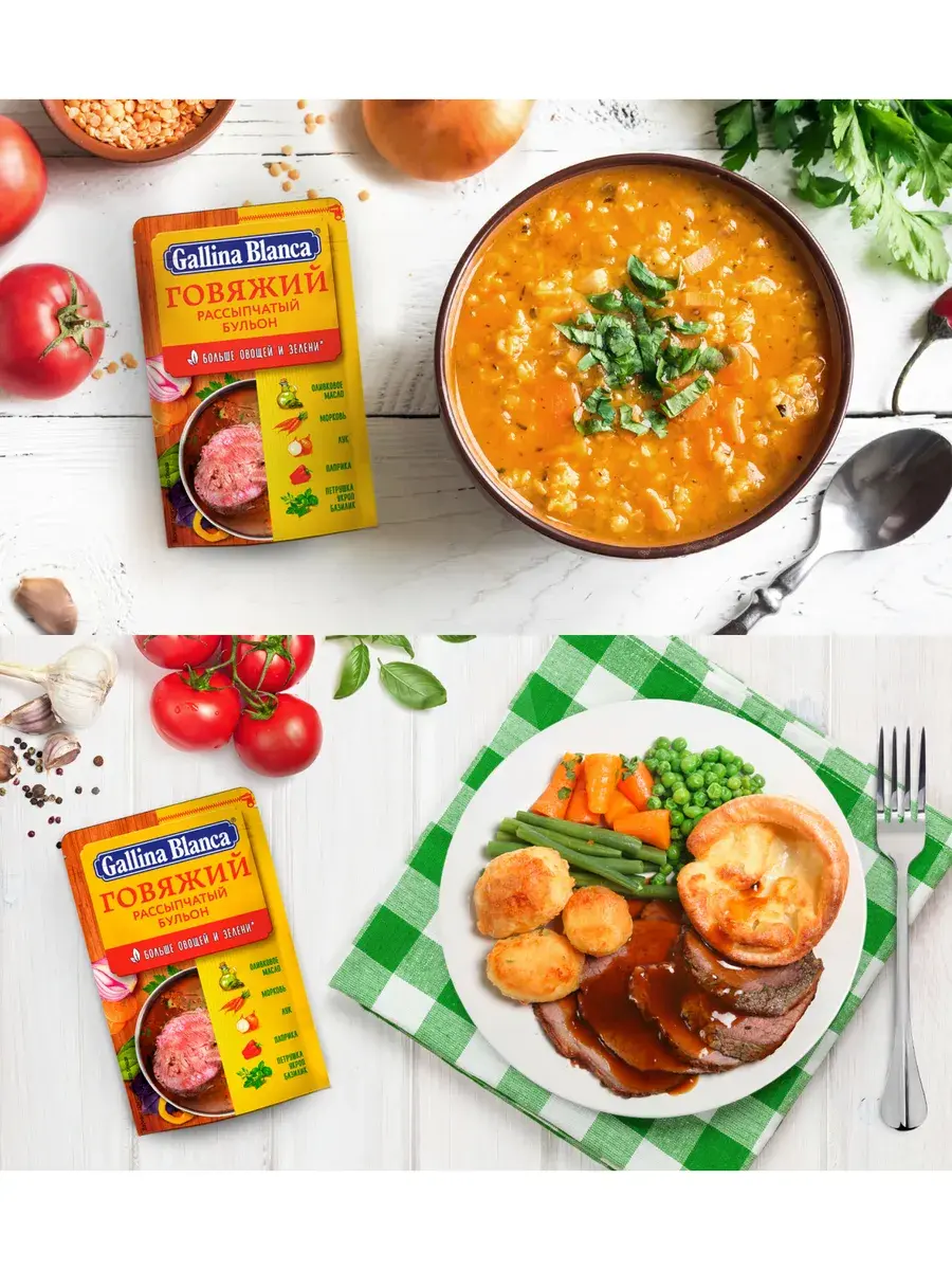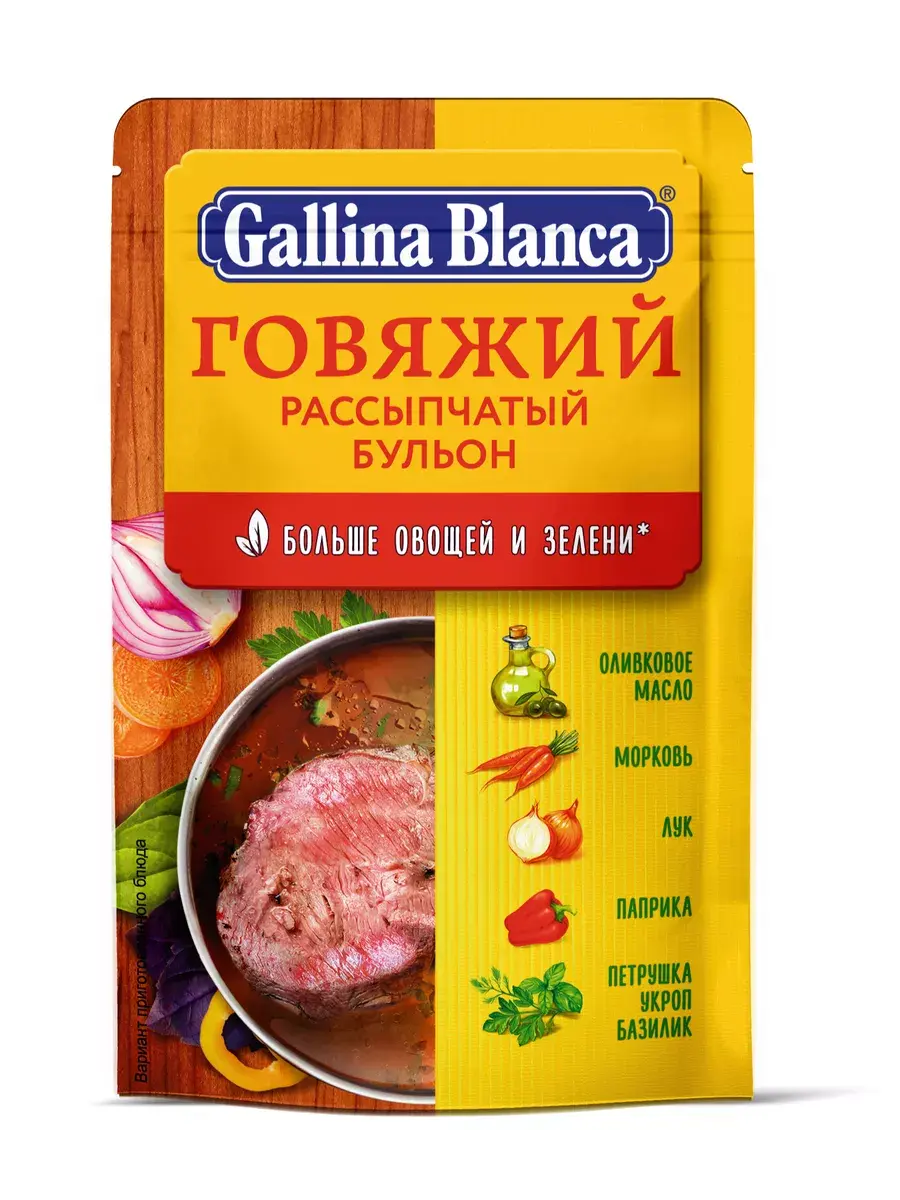 Gallina Blanca представляет новое поколение рассыпчатых бульонов с формулой, обогащенной оливковым маслом, с еще большим количеством овощей и зелени. Инновационная практичная упаковка с устойчивым дном и многоразовой застежкой делает хранение и использование продукта еще более удобным. Как приготовить Ростбиф с овощами: Шаг 1. Мясо помойте, затем многократно надрежьте края с тонким слоем жира, посолите и поперчите. Обваляйте мясо в муке, аккуратно стряхнув её излишки. Обжаривайте на сильном огне в течение 3 минут с обеих сторон. Посыпьте молотой паприкой. Шаг 2. Лук очистите и нарежьте небольшими кубиками, а вымытую и очищенную морковь — соломкой. Разогрейте в сковороде часть топлёного масла. Помешивая, тушите лук, морковную соломку и фасоль в масле на среднем огне около 5 минут. Выложите из сковороды. Шаг 3. Приготовьте 100 мл бульона с помощью «Говяжьего рассыпчатого бульона» Gallina Blanca и добавьте в него сливки для соуса. Шаг 4. Мясо положите в толстостенный сотейник, сверху равномерно распределите овощи. Залейте соусом из бульона и сливок, выложите каперсы. Доведите до кипения и тушите около получаса. Шаг 5. Сервировать блюдо можно картофельным гарниром. В комплекте 12 пакетиков по 90г.