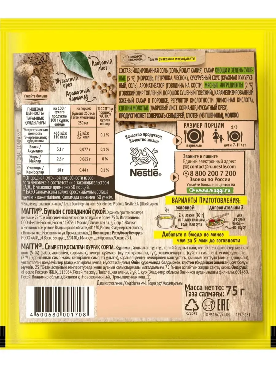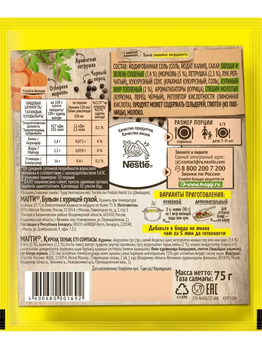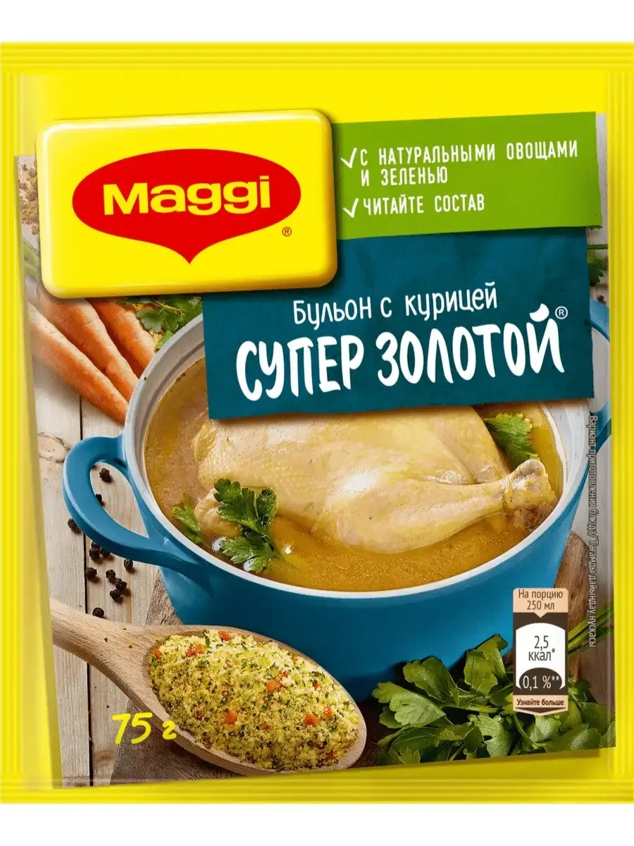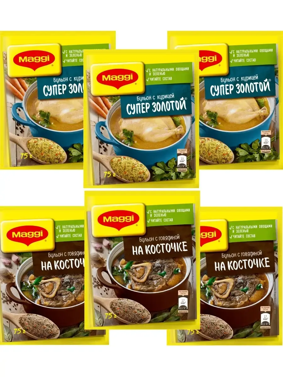 В обновлённых бульонах **MAGGI** теперь только знакомые ингредиенты. В составе натуральные овощи, ароматная зелень, пряные специи, топленый куриный и говяжий жиры и никакого пальмового масла. Производятся без добавления искусственных консервантов, а количество соли ровно столько, сколько нужно для готового блюда.