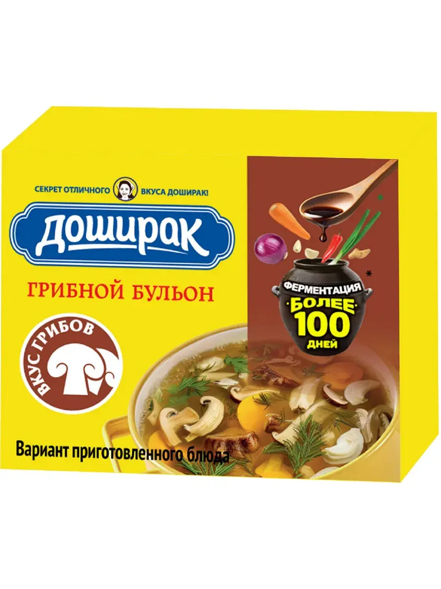 Бульонные кубики “Доширак” Грибной бульон — это универсальная основа для любых кулинарных экспериментов: от ароматного супа и насыщенного соуса до сытного жаркого и овощного рагу. Каждый кубик создан с использованием уникальных ингредиентов, прошедших особую технологию ферментации более 100 дней. Ферментация обогащает продукт живыми бактериями, придавая ему особый вкус и неповторимую глубину аромата. Такой бульон не только делает блюда насыщенными и вкусными, но и добавляет им полезные свойства. Открой секрет богатого вкуса с “Доширак” и превращай каждый прием пищи в настоящее гастрономическое удовольствие!