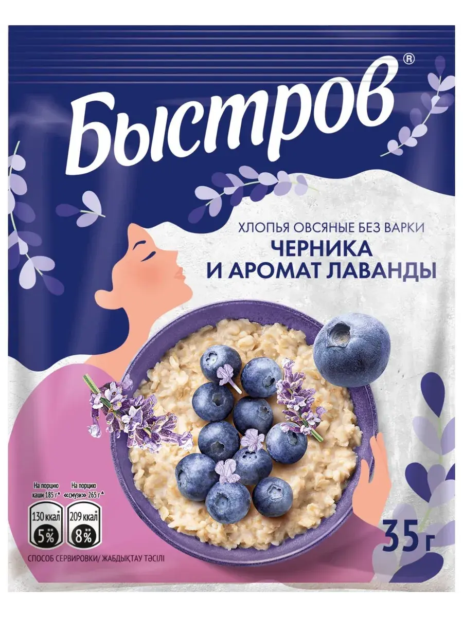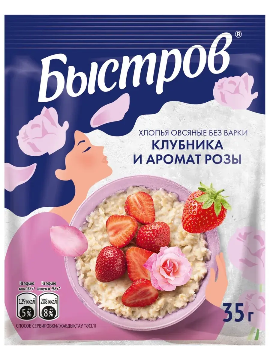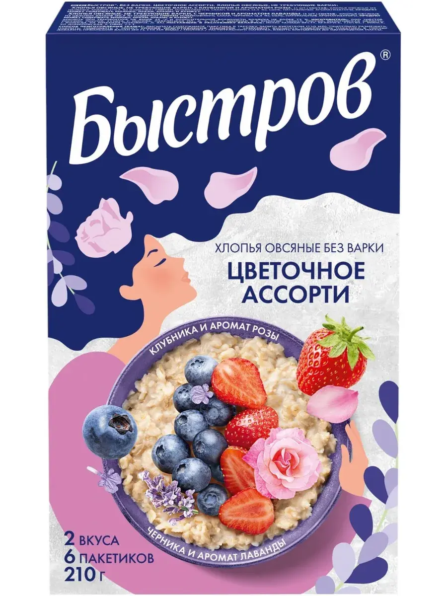 Начни утро вместе с БЫСТРОВ Цветочное ассорти: с клубникой и ароматом розы и с черникой и ароматом лаванды. Хлопья с ягодами и ароматом цветов вдохновят на новые свершения и зарядят энергией для яркого утра. Овсяные хлопья созданы только из качественных ингредиентов. Прежде чем попасть к нам в продукт, все ингредиенты проходят до 100 тестов. Основа – это натуральные хлопья из цельных злаков, в которых сохранены все компоненты овсяного зерна, а значит и полезные свойства. Каждая порция каши является источником пищевых волокон (клетчатки), необходимых для пищеварения. Спелые отборные кусочки ягод и фруктов проходят процесс быстрой заморозки, а затем под вакуумом из них удаляется влага. Данный метод позволяет сохранить структуру, цвет и вкус свежих ягод. Экспериментируй с БЫСТРОВ, ведь из наших хлопьев можно приготовить не только овсяную кашу, но и полезный и вкусный напиток – смузи.