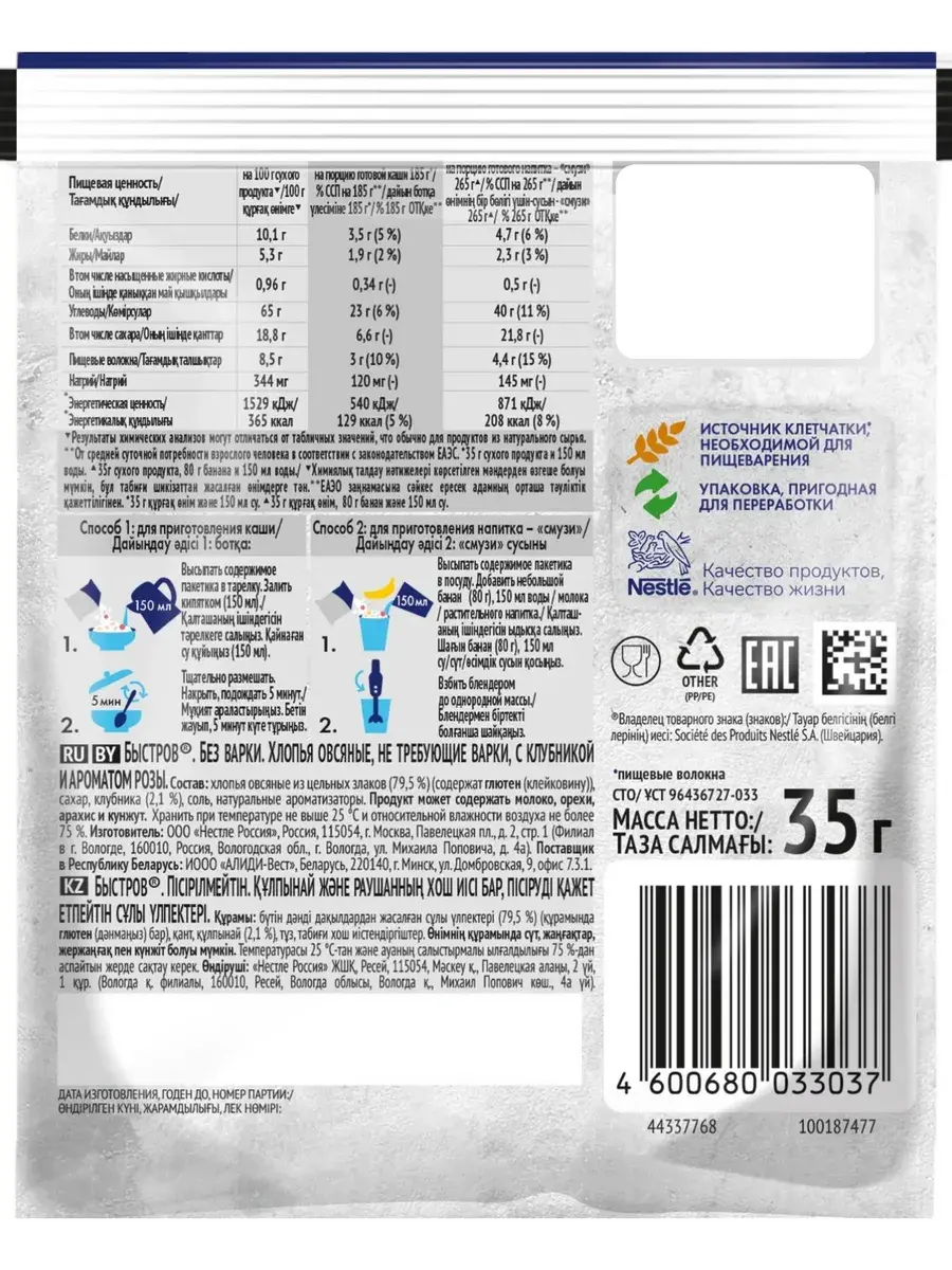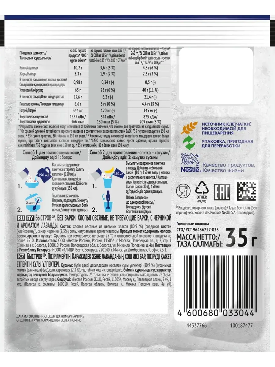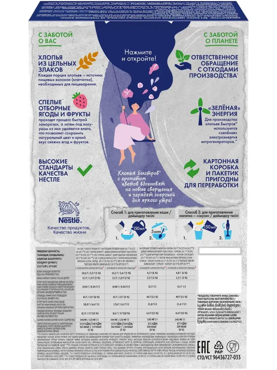 Начни утро вместе с БЫСТРОВ Цветочное ассорти: с клубникой и ароматом розы и с черникой и ароматом лаванды. Хлопья с ягодами и ароматом цветов вдохновят на новые свершения и зарядят энергией для яркого утра. Овсяные хлопья созданы только из качественных ингредиентов. Прежде чем попасть к нам в продукт, все ингредиенты проходят до 100 тестов. Основа – это натуральные хлопья из цельных злаков, в которых сохранены все компоненты овсяного зерна, а значит и полезные свойства. Каждая порция каши является источником пищевых волокон (клетчатки), необходимых для пищеварения. Спелые отборные кусочки ягод и фруктов проходят процесс быстрой заморозки, а затем под вакуумом из них удаляется влага. Данный метод позволяет сохранить структуру, цвет и вкус свежих ягод. Экспериментируй с БЫСТРОВ, ведь из наших хлопьев можно приготовить не только овсяную кашу, но и полезный и вкусный напиток – смузи.