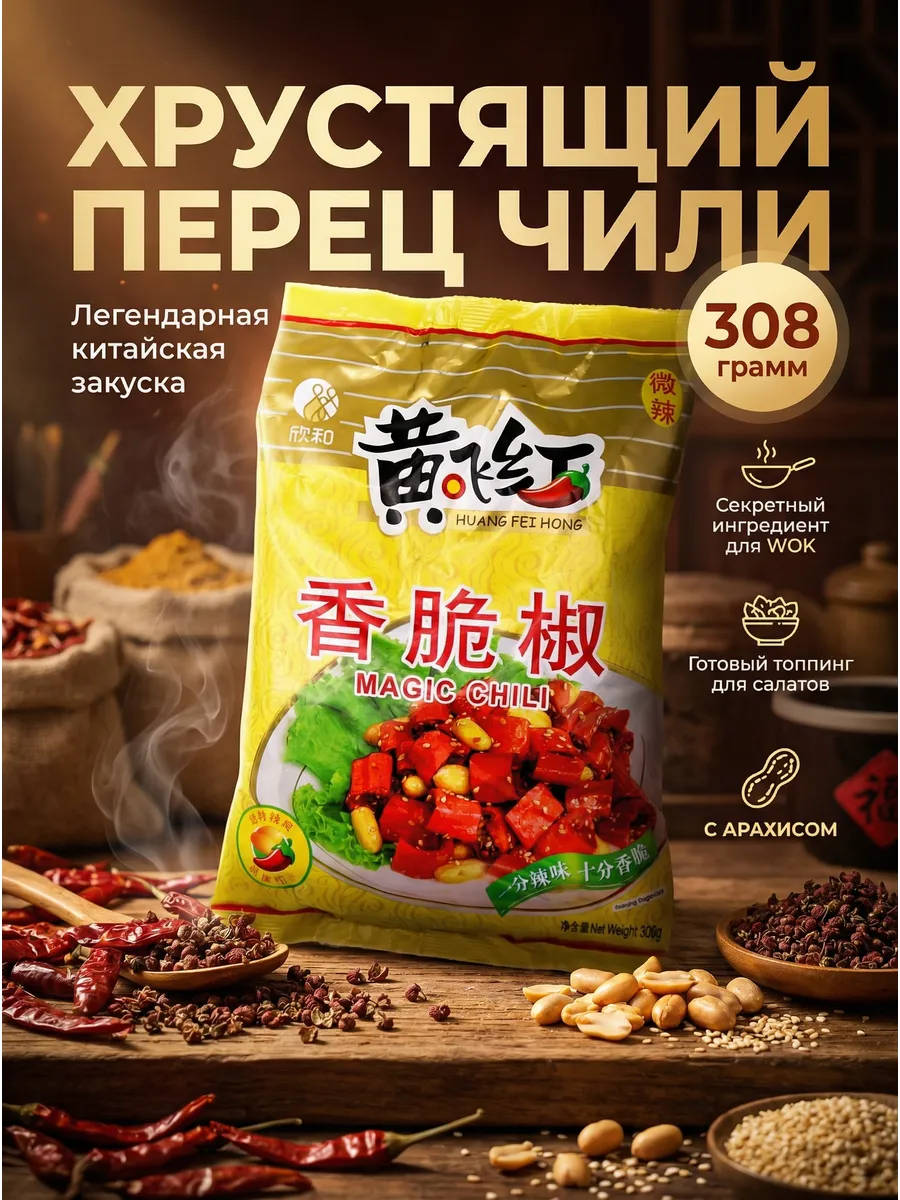 Уникальный микс: Отборный обжаренный арахис, крупные хрустящие кусочки перца чили и ароматный кунжут.