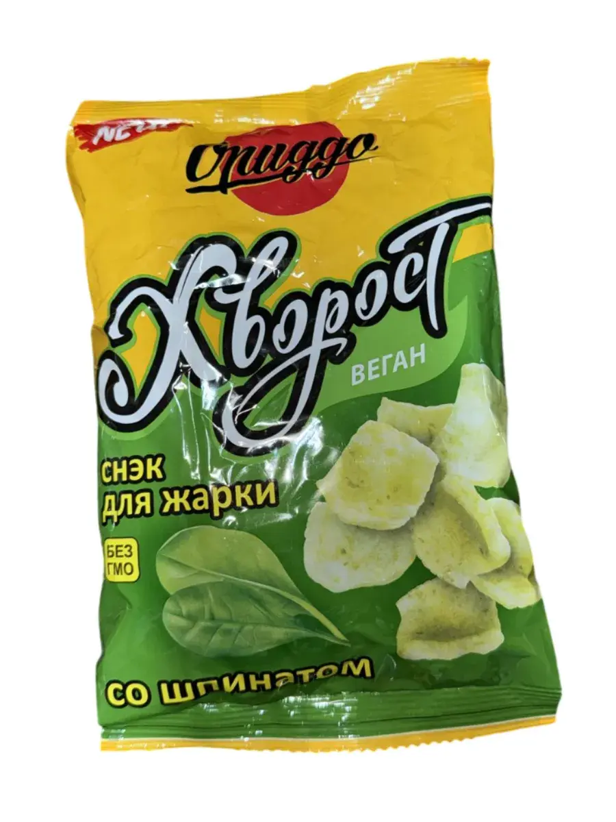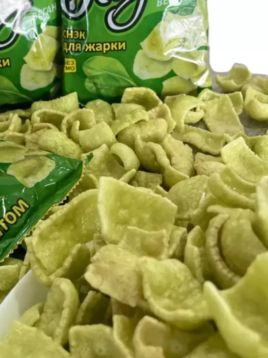 Попробуйте веганский снэк для жарки со шпинатом — это не просто чипсы, это настоящий хрустящий шедевр! Без ГМО. Содержит натуральный шпинат для тех, кто заботится о своём здоровье. Эти чипсы — идеальный выбор как для быстрой закуски, так и для вечеринки с друзьями! Наслаждайтесь хрустом с пользой, ведь это не просто вкусно, но и полезно. Хворост со шпинатом: когда каждый кусочек — шаг к правильному питанию и удовольствию. Попробуйте и убедитесь сами! Такие чипсы легко приготовить дома: налейте растительное масло в сковороду, кастрюлю или во фритюрницу. После того, как масло разогреется можно погружать хворост по несколько штук. За несколько секунд снеки увеличатся в объеме — теперь их можно доставать шумовкой, и выкладывать на тарелку.