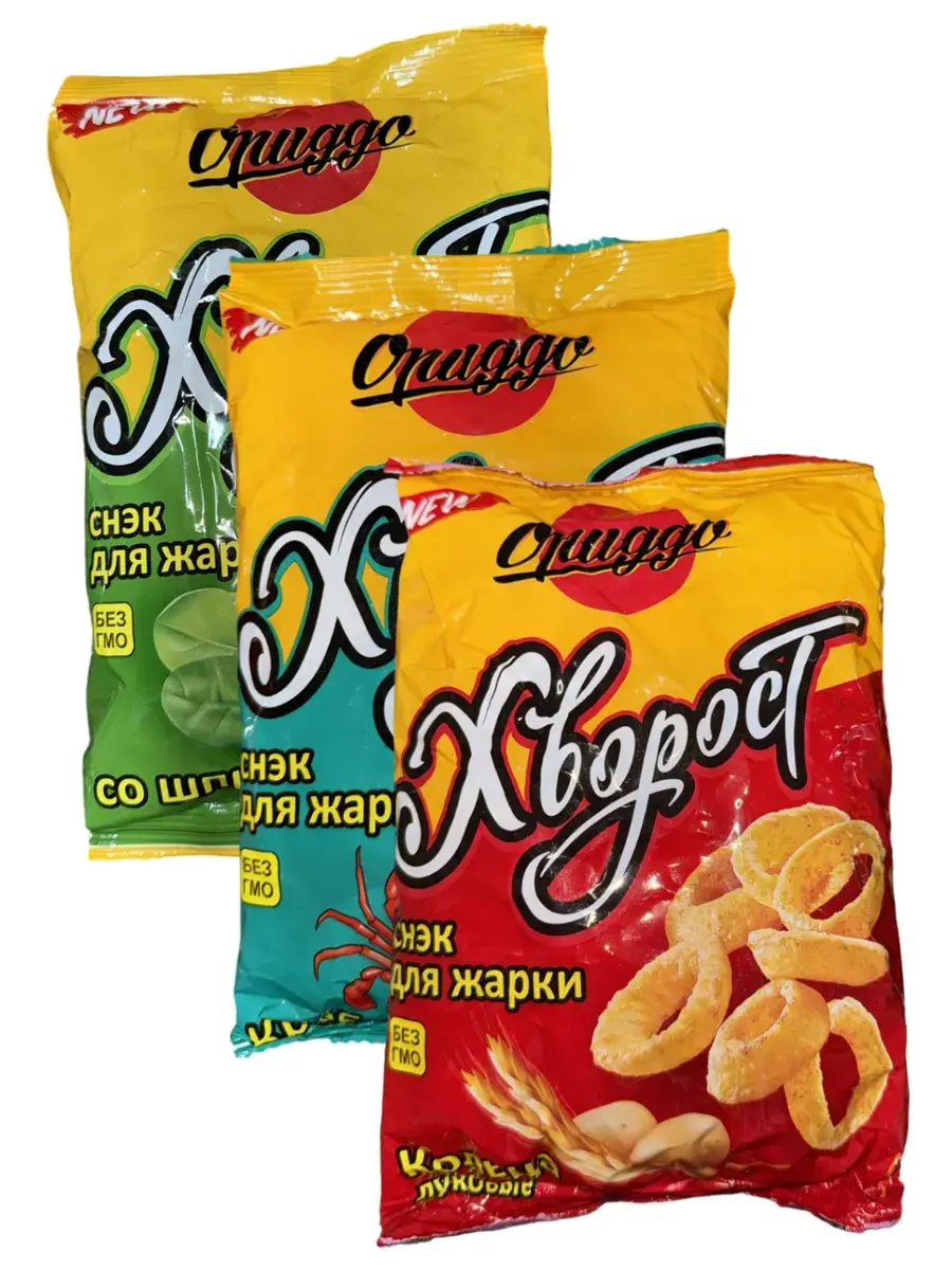 Попробуйте веганский снэк для жарки со шпинатом — это не просто чипсы, это настоящий хрустящий шедевр! Содержит натуральный шпинат для тех, кто заботится о своём здоровье. Подходит для веганского меню. Пшеничные чипсы в форме крабиков — это идеальный снэк для жарки, который придаст вашему дню нотку веселья и вкуса моря! Пшеничные чипсы в форме луковых колец — снэк, который добавит в ваш день вкус и хруст, от которого невозможно оторваться! Без ГМО. Такие чипсы легко приготовить дома: налейте растительное масло в сковороду, кастрюлю или во фритюрницу. После того, как масло разогреется можно погружать хворост по несколько штук. За несколько секунд снеки увеличатся в объеме — теперь их можно доставать шумовкой, и выкладывать на тарелку.