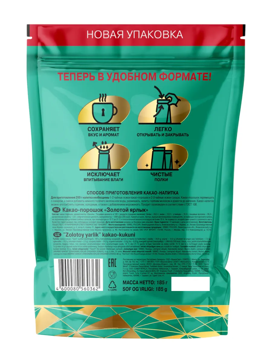 Какао-порошок «Золотой Ярлык» – самая знаменитая марка российского какао. Натуральный какао-порошок производит «Красный Октябрь» с начала ХХ века, и точно такой же порошок используется на фабрике при производстве шоколада и конфет. В домашних условиях «Золотой Ярлык» становится ароматным горячим шоколадом или молочным какао, глазурью для любимой выпечки. Яркий многогранный шоколадный вкус, сдобренный нотками ванили – для фирменных домашних десертов и кулинарных экспериментов. «Красный Октябрь» – старейшее и известнейшее кондитерское предприятие страны, основанное в 1849 году. Сейчас производственные площадки компании расположены в современных зданиях и оснащены самым передовым оборудованием, а качество выпускаемой продукции соответствует всем нормативам и ГОСТам РФ, а также европейским стандартам производства.