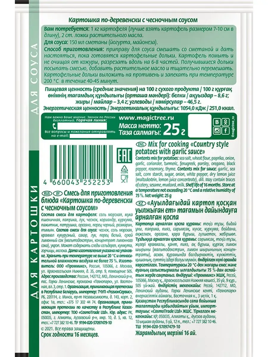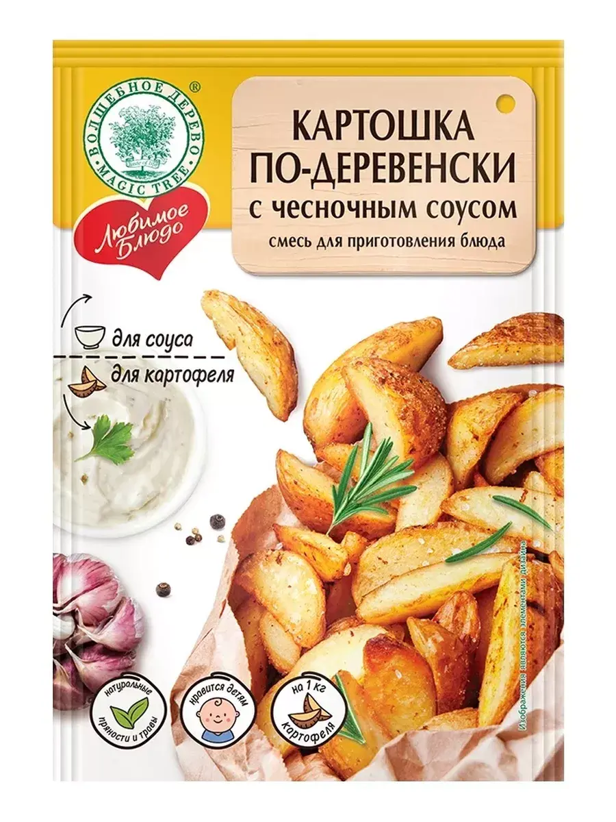 Картошкой по-деревенски (или по-селянски) называют запеченный в духовке неочищенный картофель, нарезанный на дольки и приправленный специями. В приправе Волшебное дерево идеально подобранные специи облегчат приготовление блюда. В одном пакетике приправы две секции: одна для картофеля, вторая для приготовления соуса. Для приготовления соуса понадобится только сметана. В комплекте 5 штук по 25г.