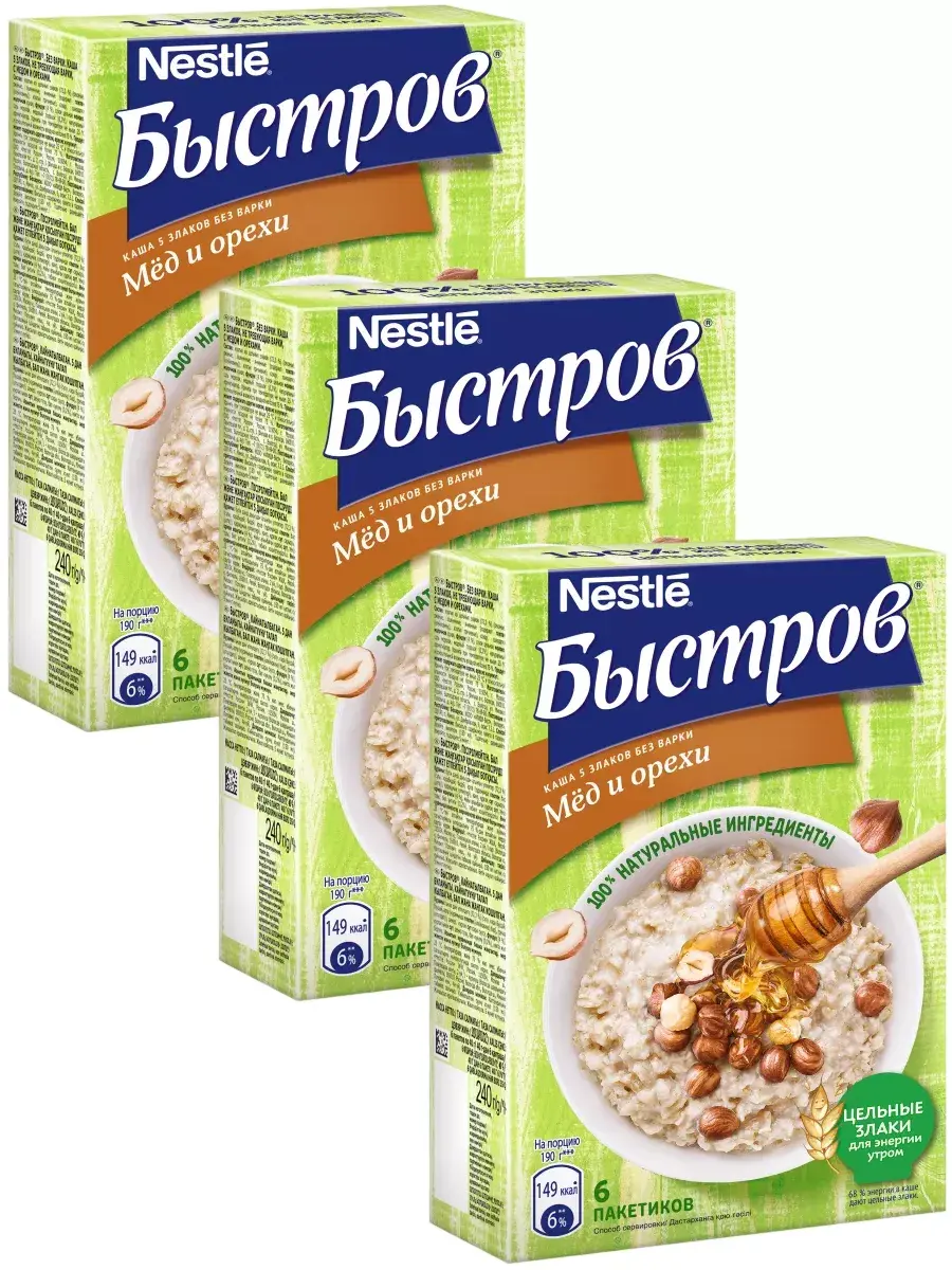 Начни утро с полезных каш Быстров! В хлопьях сохранены все полезные компоненты овсяного зерна (оболочка, эндосперм и зародыш), а значит максимум полезных свойств. Каждая порция каши является источником пищевых волокон (клетчатки), необходимых для пищеварения. Хлопья в каше такие же полезные, как и варимые, но они тоньше поэтому для приготовления их достаточно залить кипятком. Способ приготовления: высыпьте содержимое пакета в тарелку. Залейте кипятком (160 мл). Тщательно размешайте. Накройте, подождите 5 минут. В комплекте 3 пачки по 240г. В каждой пачке по 6 пакетиков.