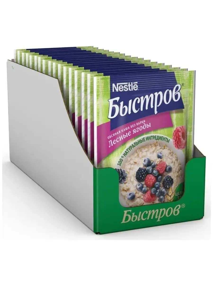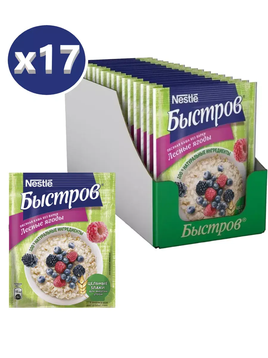 Начни утро с полезных каш Быстров! В хлопьях сохранены все полезные компоненты овсяного зерна (оболочка, эндосперм и зародыш), а значит максимум полезных свойств. Каждая порция каши является источником пищевых волокон (клетчатки), необходимых для пищеварения. Хлопья в каше такие же полезные, как и варимые, но они тоньше поэтому для приготовления их достаточно залить кипятком. Спелые отборные кусочки лесных ягод проходят процесс быстрой заморозки, а затем под вакуумом из них удаляется влага. Данный метод позволяет сохранить структуру, цвет и вкус свежих ягод. Способ приготовления: высыпьте содержимое пакета в тарелку. Залейте кипятком (160 мл). Тщательно размешайте. Накройте, подождите 5 минут. В комплекте 1 блок, в котором 17 пакетиков по 40г.