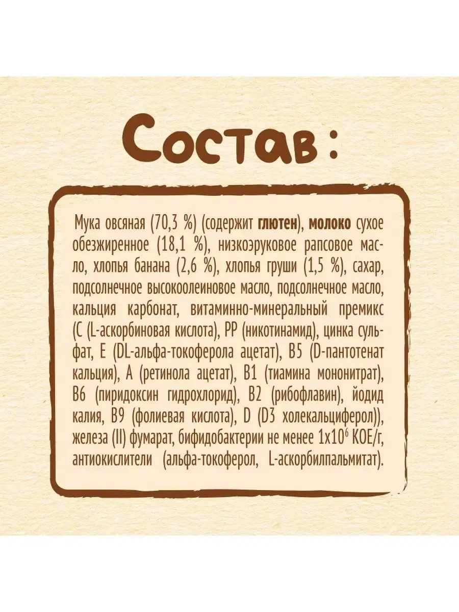 Мука овсяная (70,3 %) (содержит глютен), молоко сухое обезжиренное (18,1 %), смесь растительных масел (низкоэруковое рапсовое, подсолнечное высокоолеиновое, подсолнечное), антиокислители (L-аскорбилпальмитат, альфа-токоферол, лимонная кислота), хлопья банана (2,6 %), хлопья груши (1,5 %), сахар, минеральные вещества (кальция карбонат, железа (II) фумарат, цинка сульфат, йодид калия), витамины (С (L-аскорбиновая кислота), E (DL-альфа-токоферола ацетат), РР (никотинамид), B5 (D-пантотенат кальция), A (ретинола ацетат), В1 (тиамина мононитрат), В6 (пиридоксин гидрохлорид), В2 (рибофлавин), B9 ( фолиевая кислота), D (D3 холекальциферол)), бифидобактерии не менее 1х10^6 КОЕ/г.