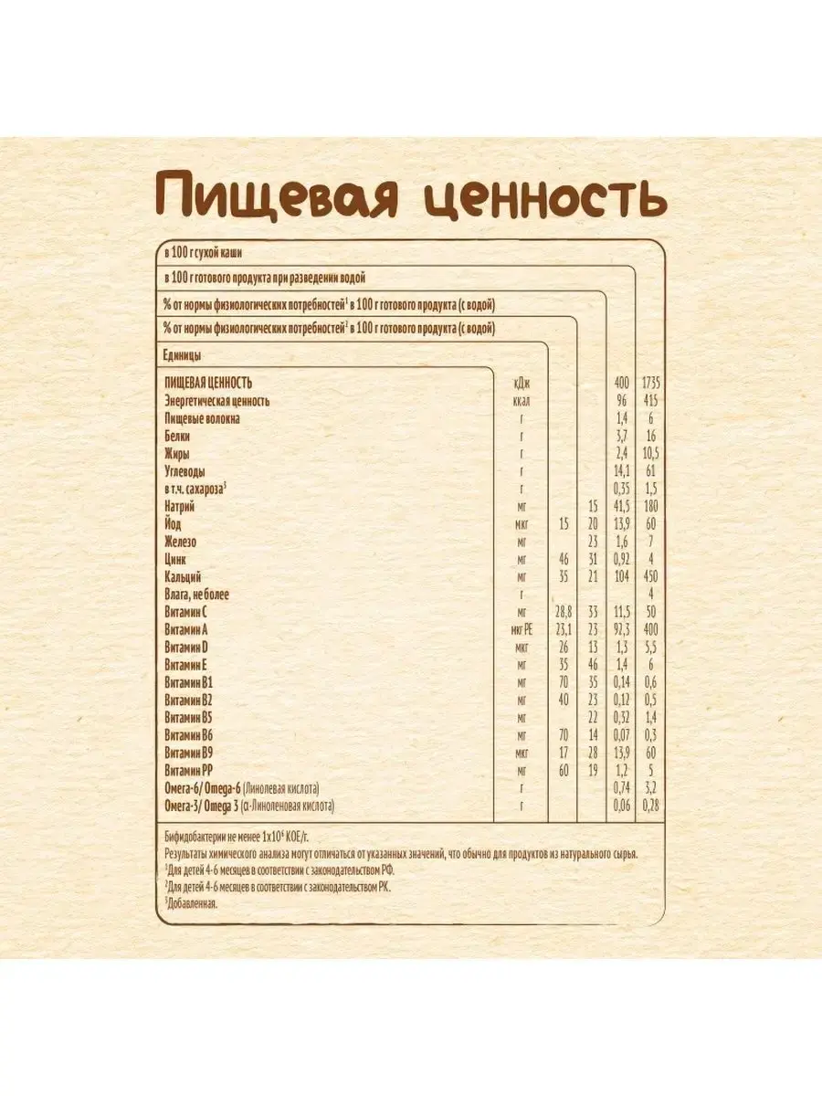 Каша обогащена пробиотиком BL, который способствует формированию здоровой микробиоты кишечника, а также укреплению иммунитета. Содержит комплекс витаминов и минералов, важных для здорового роста и развития ребенка. Приятный вкус злаков и фруктов порадует вашего малыша на этапе расширения рациона. Без пальмового масла.