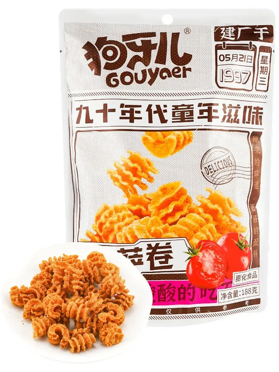 Пицца-ролл — оригинальные чипсы, сочетающие в себе уникальный вкус и текстуру! Сделанные из рисовой и пшеничной муки, они представляют собой нечто среднее между хрустящими картофельными чипсами и ароматными сухариками. Благодаря слегка сладковатому привкусу, характерному для китайских закусок, специи раскрываются ещё ярче. Хрустящие, острые и совершенно неотразимые — эти чипсы Gouyaer перенесут вас в атмосферу 90-х! Вдохновленные вкусами детства, но с современным акцентом, они идеально подойдут как для компании, так и для личного удовольствия. Ощутите магию любимых уличных закусок в каждом кусочке!