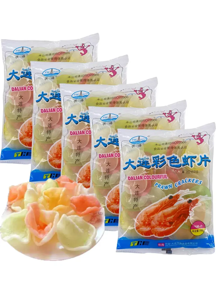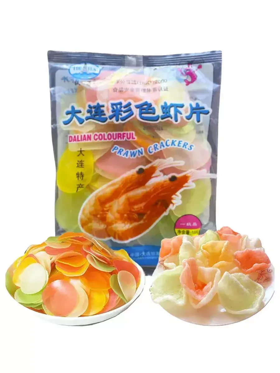 Китайские креветочные чипсы Prawn Crackers — быстрая хрустящая закуска, на случай неожиданных гостей или внезапных посиделок. Воздушные и хрустящие чипсы после обжарки имеют свежий, приятный вкус креветочного мяса, слегка солоноватый. Чипсы предназначены для домашнего приготовления. Приготовить чипсы со вкусом креветок очень легко. Достаточно в эмалированной посуде нагреть рафинированное растительное масло, опустить в него пластинки крекеров (лучше по одной штуке) на несколько секунд и быстро вынимать. Как чипсы раздулись и стали воздушными - готово. Время жарки 5 секунд. Готовые чипсы можно раскрошить и посыпать на салат. Креветочные чипсы являются легкой закуской, рекомендуется употреблять с различными соусами, а также можно использовать как украшение к блюдам. В наборе 5 индивидуальных упаковок по 160 грамм.