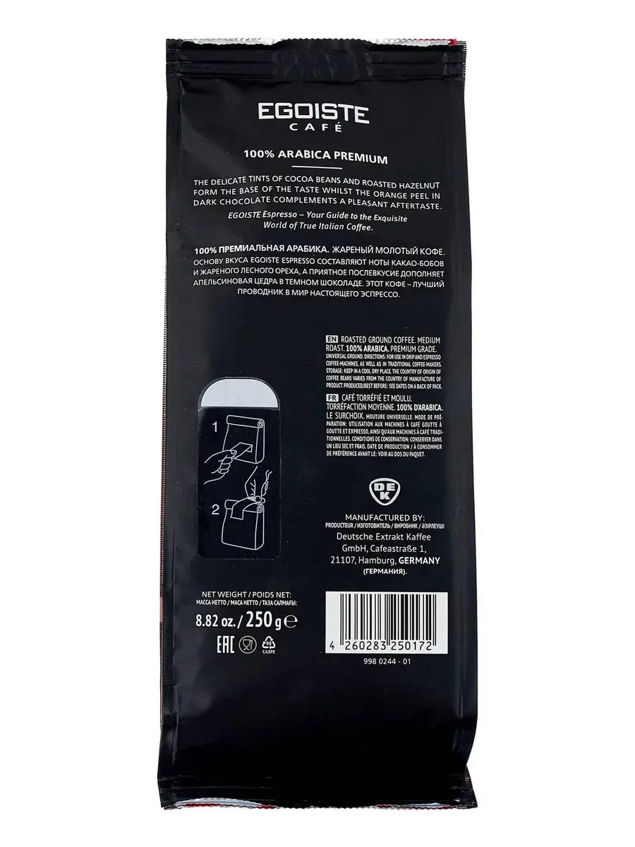 Молотый кофе для истинных ценителей. Погрузитесь в мир изысканного вкуса с молотым кофе EGOISTE — воплощением аристократичности и страсти к совершенству. Этот 100% арабика премиум-класса создан для тех, кто ценит каждую ноту аромата и стремится к безупречному кофейному опыту. Почему EGOISTE? Интенсивный вкус: Гармония бархатистого крема, сладковатых карамельных нот и легкой фруктовой кислинки. Идеальный помол: Оптимальная степень измельчения для эспрессо — насыщенного, с густой пенкой и долгим послевкусием. Немецкое качество: Обжарка и упаковка в Германии гарантируют безупречный стандарт на каждом этапе. Используйте турку или эспрессо-машину, чтобы ощутить всю глубину вкуса. Добавьте щепотку корицы или тёмного шоколада — и ваш утренний ритуал превратится в момент наслаждения.
