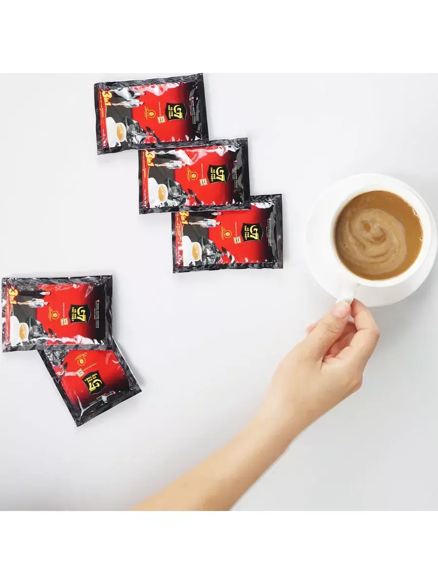 Растворимый кофе TRUNG NGUYEN G7 3 in 1 - флагман в линейке растворимого кофе от крупнейшей вьетнамской кофейной компании. В обширном перечне растворимого кофе G7, данная позиция является самым ярким представителем классического вьетнамского растворимого кофе. Входящие в состав растительные сливки гипоаллергенны и могут быть рекомендованы людям с нарушениями иммунной системы. Оригинальный кофе, произведенный для внутреннего рынка Вьетнама и знакомый многим тем, кто побывал во Вьетнаме и прочувствовал все райские моменты своего путешествия. Вьетнамцы рекомендуют добавлять два пакетика кофе G7 на одну чашку, для достижение яркого вкуса.