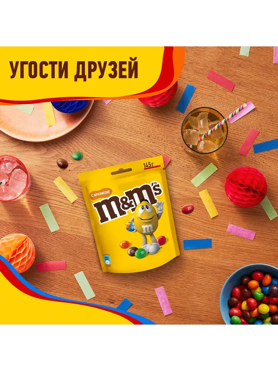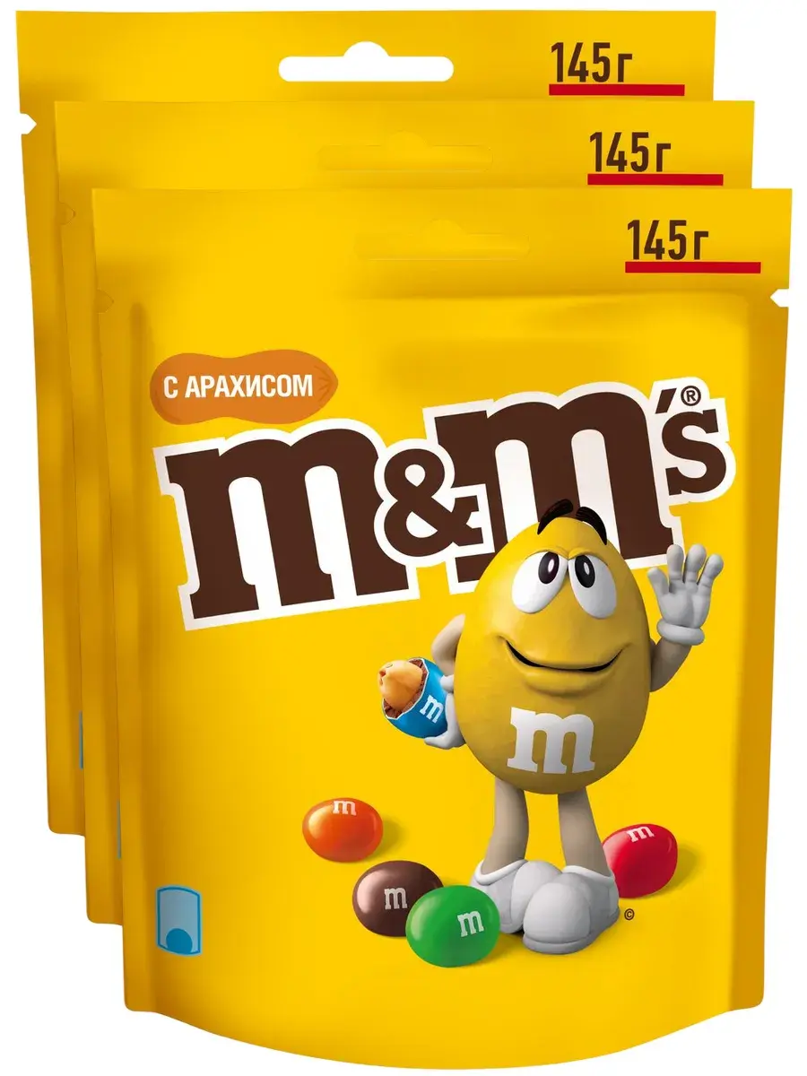 Немного арахиса + много вкуса = безудержное веселье. Берите на любой праздник пару пачек вкусного угощения M&M's с арахисом в молочном шоколаде! Пачка идеально подойдет как для просмотра кино или сериала, так и для того, чтобы взять с собой в дорогу и не ждать весь день, а получить удовольствие даже от утренней поездки на работу. Возьмите одну из упаковок в офис и порадуйте себя и коллег! Попробуйте добавить M&M’s в ваши любимые десерты, чтобы удивить родных и близких или просто побаловать себя. В комплекте 3 пачки по 145г.