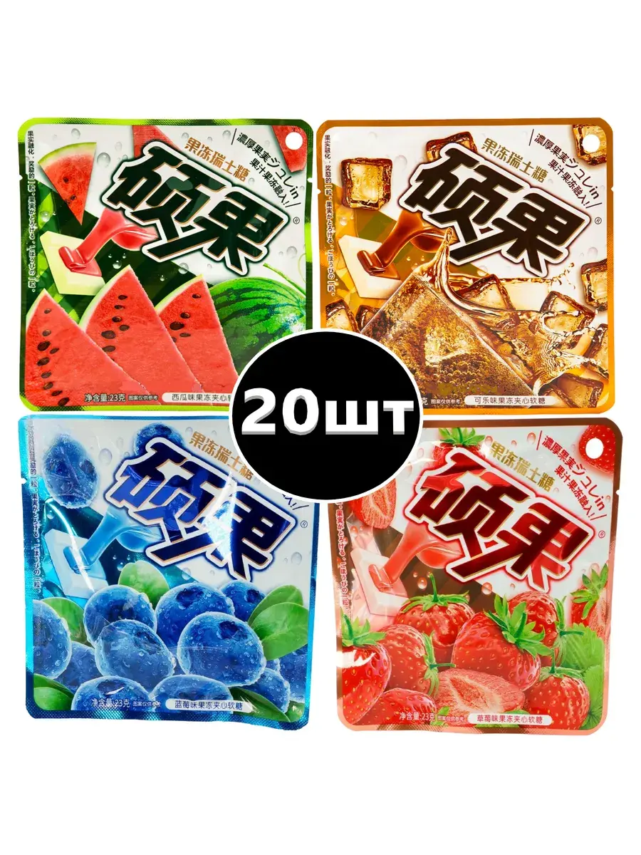Забудьте о серых буднях! Подарите себе и своим близким порцию радости с жевательными конфетами со вкусом арбуза, колы, черники и клубники. Жевательные конфеты невероятно мягкие, а мармеладная начинка добавляет удивительное ощущение нежности при каждом укусе. Идеально подходит для прогулок, путешествий или просто для того, чтобы поднять себе настроение! Это не просто сладость — это маленький кусочек лета, который вы можете взять с собой куда угодно. Удобная упаковка позволяет наслаждаться сладким моментом в любое время и в любом месте — на прогулке, на учебе или в офисе. В наборе по 5 пачек каждого вкуса.