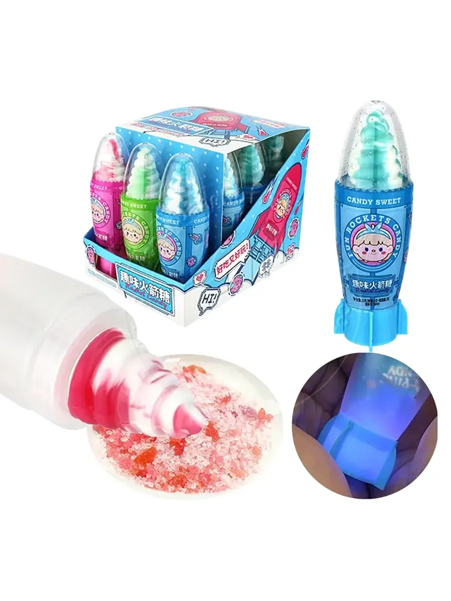 Светящиеся ракеты — это не просто конфеты, это сладкое путешествие в космос! Яркая ракета с леденцом на вершине ждет запуска! Просто обмакните её в шипучую пыльцу, и начнется настоящий вкусный взрыв. А когда наступает темнота, ракета загорается магическим светом, превращая обычное угощение в настоящее шоу! Взрывная карамель в сочетании с фруктовыми леденцами — наслаждайся вкусом и покори свой космос! Светящиеся ракеты — для тех, кто любит мечтать, исследовать и наслаждаться необычными сладостями. Запускай вкусное путешествие прямо сейчас. В блоке 20 ракет.