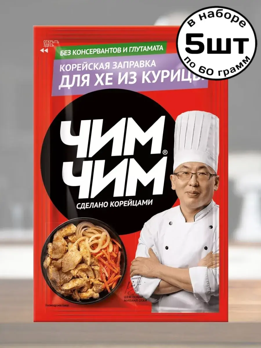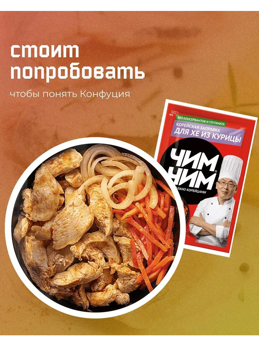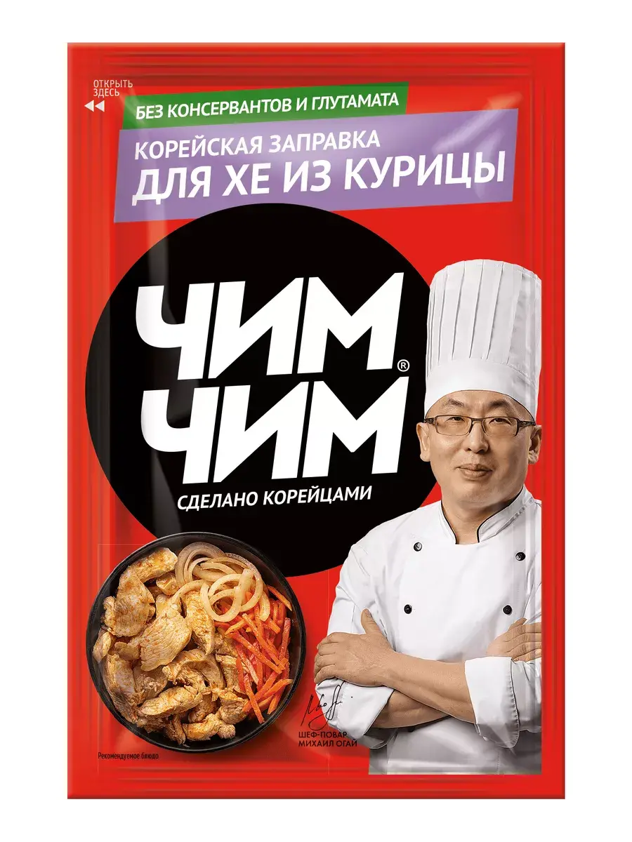 Корейская заправка ЧИМ ЧИМ для Хе из курицы идеально подходит для приготовления традиционного блюда из птицы. Продукт можно также использовать для создания аппетитных салатов из моркови, «стеклянной лапши», спаржи и капусты. Заправка обладает чудесным насыщенным ароматом чеснока, паприки и кориандра. Для того чтобы приготовить блюда корейской кухни, нужно всего лишь добавить содержимой упаковки в уже подготовленные ингредиенты и оставить на тридцать минут. Заправку можно также дополнить острым перцем или другими специями. 1 пакетик заправки рассчитан на 600 г салата.