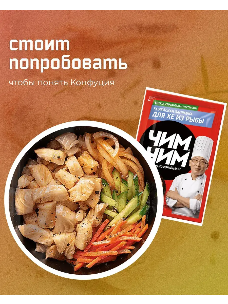 Откройте для себя вкус настоящей Кореи с заправкой ЧИМ ЧИМ для Хе из рыбы! Один пакетик заправки рассчитан на 600 граммов салата, что идеально подходит для приготовления традиционного корейского блюда, которое понравится всей семье и гостям. Приготовление: Филе рыбы без кожи нарежьте вдоль волокон на брусочки 1х5 см, добавьте 1/2 чайной ложки соли и хорошо перемешайте. Влейте уксус, перемешайте и оставьте мариноваться примерно на 1 час, периодически помешивая. Рыба готова, когда она побелеет внутри кусочков. Слейте выделившийся сок и хорошо отожмите. Добавьте лук, нарезанный полукольцами, морковь и огурец, нарезанные соломкой. Влейте содержимое пакетика, соевый соус и масло. Все тщательно перемешайте и дайте салату настояться 1 час.