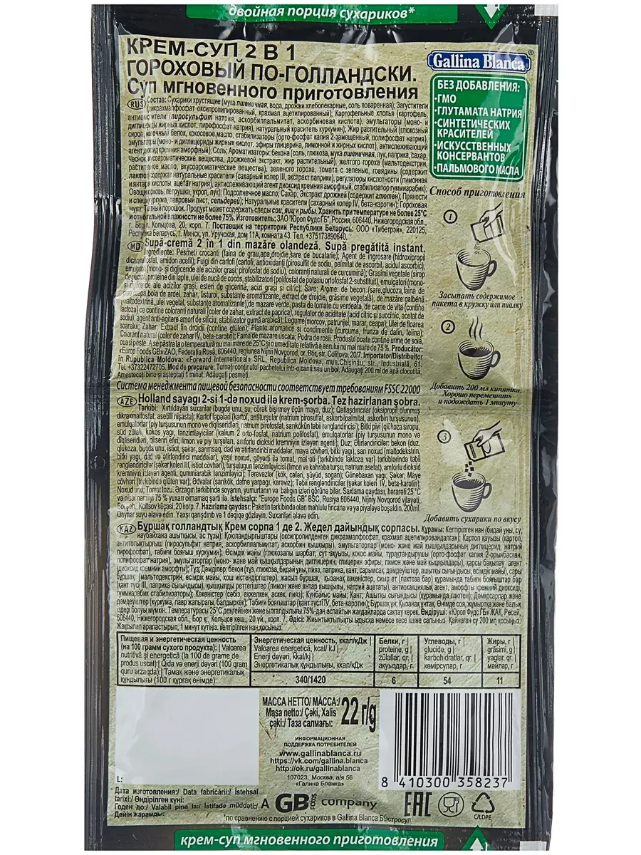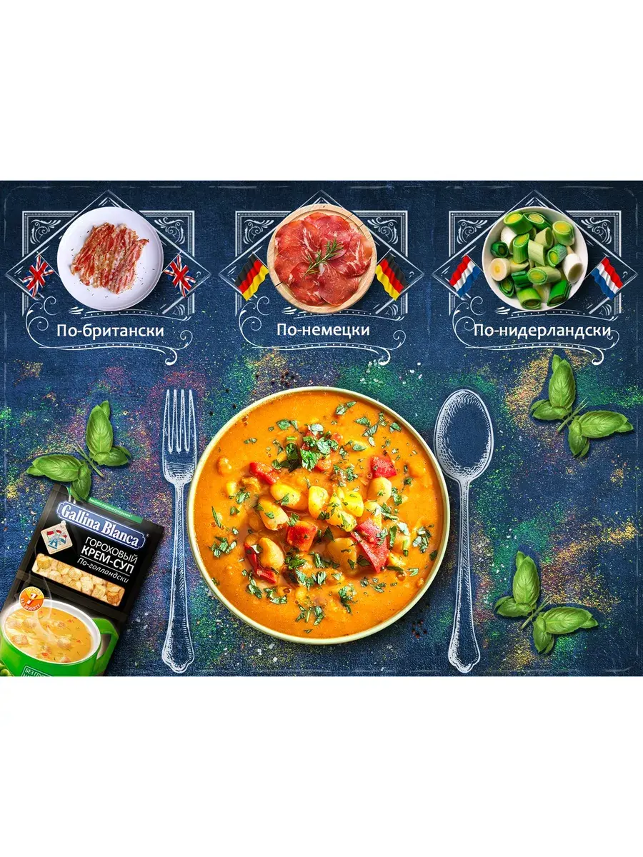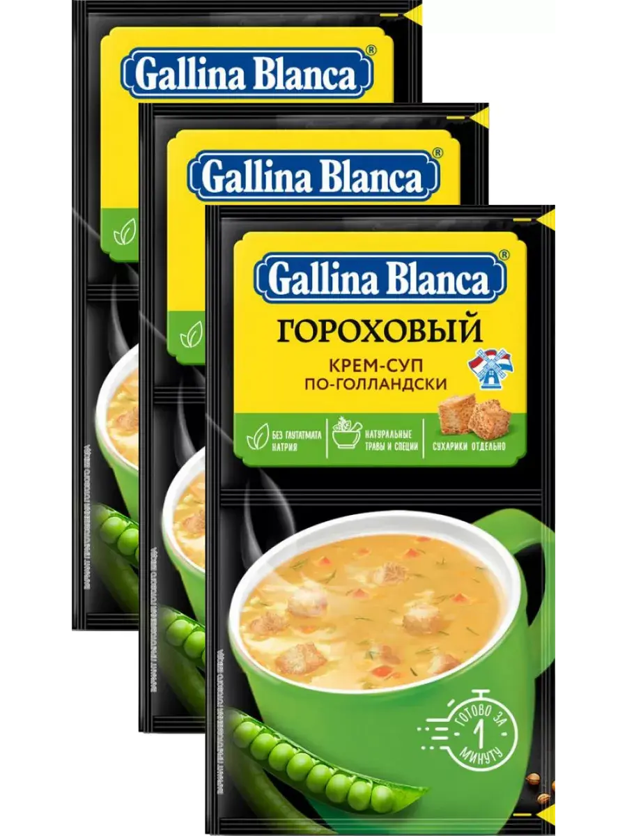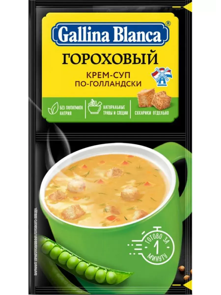 Gallina Blanca представляет крем-суп гороховый по-голландски с хрустящими сухариками, воплотивший в себе лучший рецепт от жителей Голландии, которые предпочитают готовить это питательное блюдо зимой. Попробуйте густой и насыщенный крем-суп и насладитесь его нежным гороховым вкусом в любое удобное время. Удобная упаковка с раздельным расположением супа и сухариков.